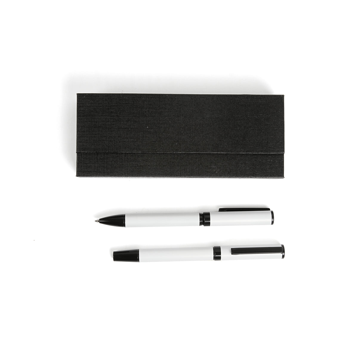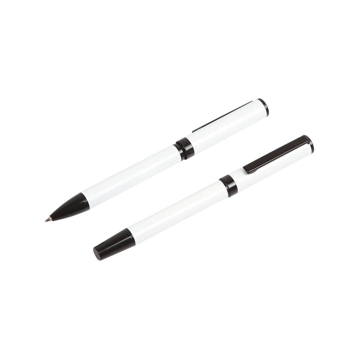 set ejecutivo de dos bolígrafos metálicos color blanco con detalle en negro, incluye caja de regalo. un bolígrafo con mecanismo retráctil y otro con mecanismo twist.