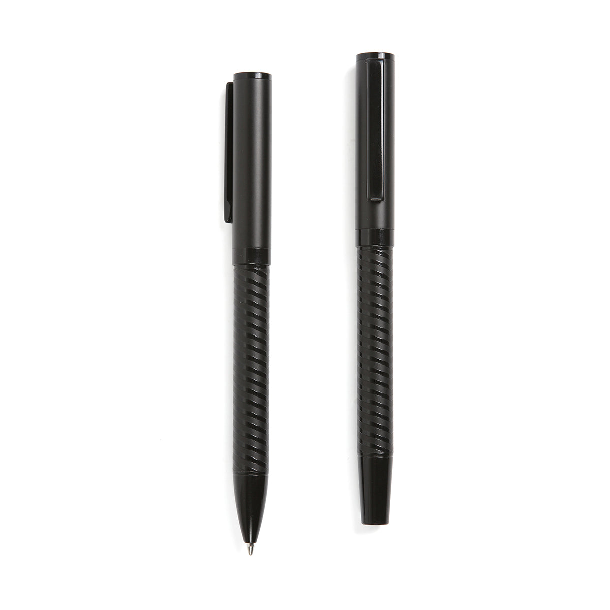set ejecutivo de dos bolígrafos metálicos negros, incluye caja de regalo. un bolígrafo con mecanismo retráctil y otro con mecanismo twist.