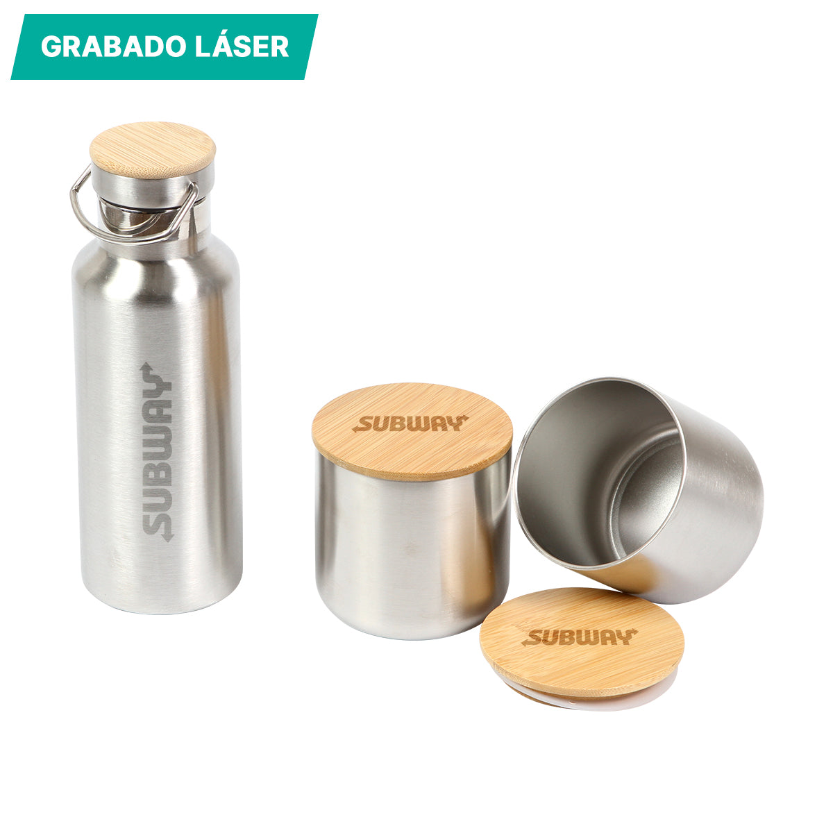 set de botella y dos tazas, fabricadas en acero inoxidable reciclado doble pared con detalle tipo madera. capacidad de botella 500 ml., tazas 350 ml. incluye caja de regalo. el regalo perfecto para los amantes de las aventuras y el estilo.