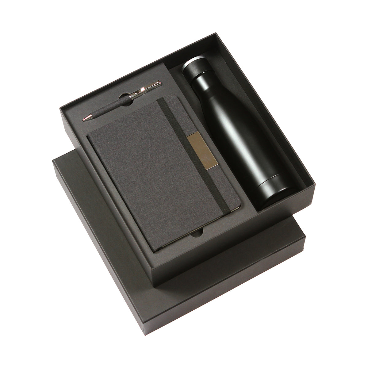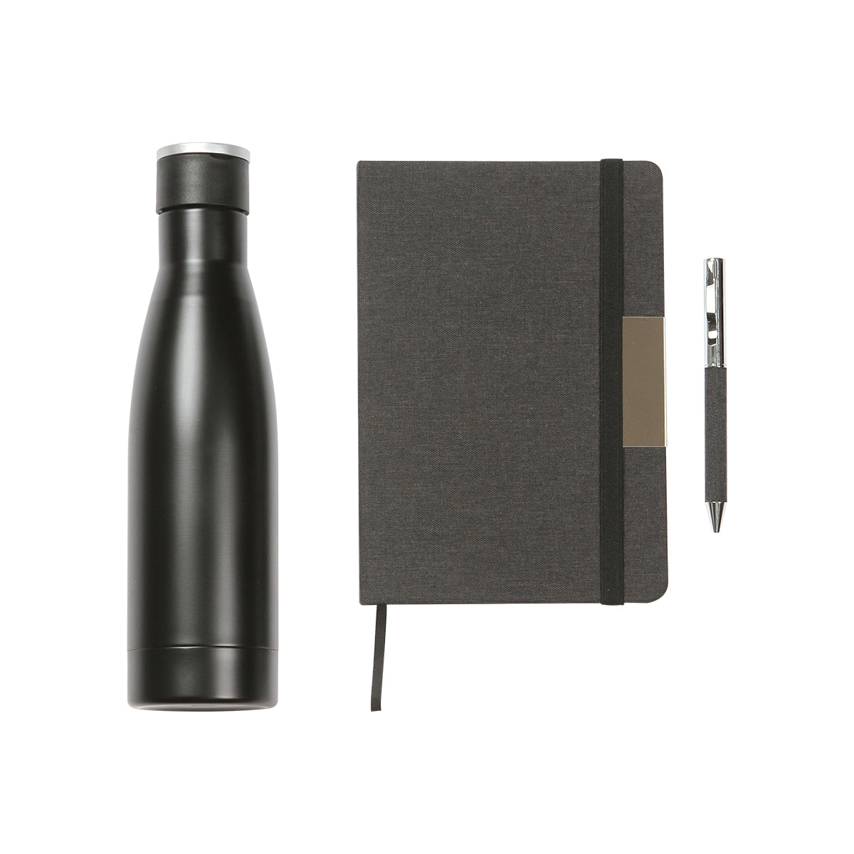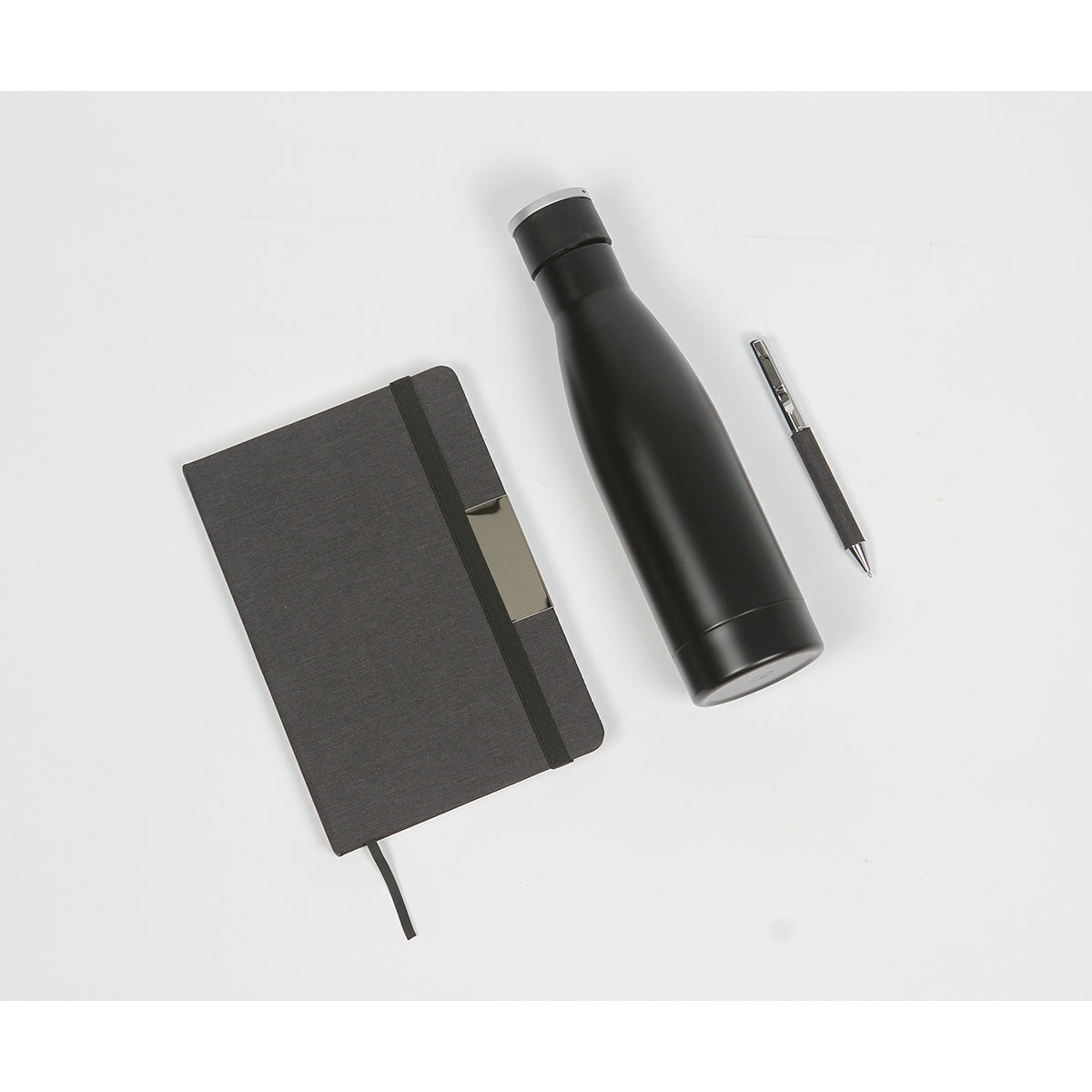 set ejecutivo, incluye un bolígrafo de barril fabricado en latón y acero inoxidable con detalles en tela de pet reciclado, tinta de escritura azul. incluye también un termo de doble pared fabricado en acero inoxidable, capacidad de 500 ml. y libreta tamaño a5 con 80 hojas de 70g, cubierta de tela de pet reciclado. incluye caja de regalo negra.