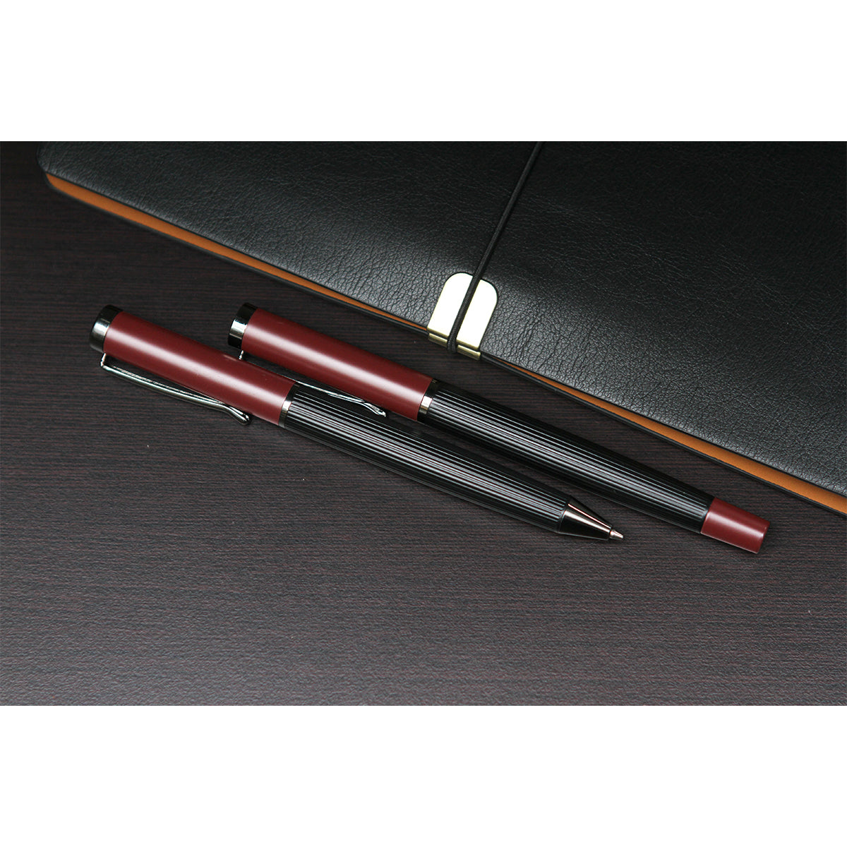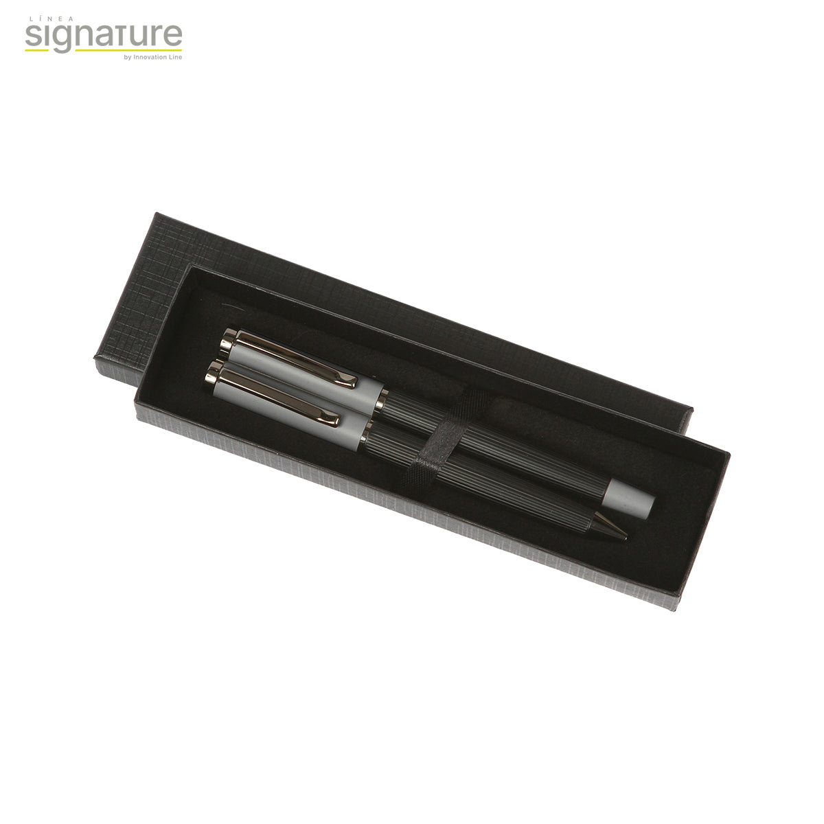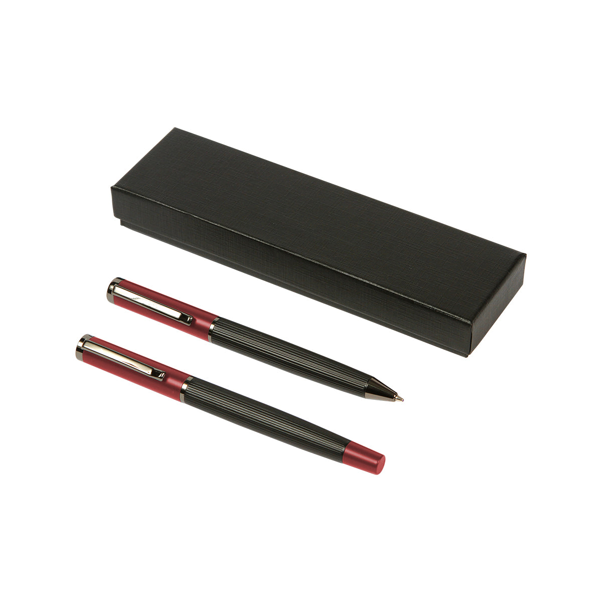 juego de bolígrafos con barril fabricado en acero inoxidable, con detalles en color plateado, uno de ellos tipo roller pen con tinta en gel y el otro tipo ball pen con tinta normal. tinta de escritura color negro. incluye caja de regalo color negro.