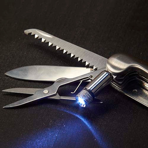 navaja de bolsillo con 11 funciones. incluye tijeras, serrucho, sacacorchos, destapador, desarmador con punta de cruz, desarmador con punta plana, navaja grande, 3 navajas chicas, lámpara de 1 led con 3 baterías de botón (incluidas), llavero y funda.