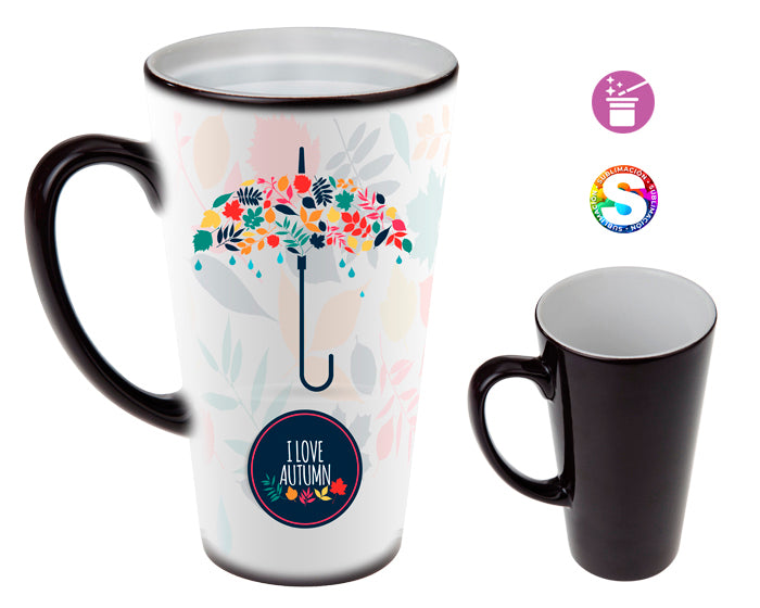 taza mágica cónica de sublimación. el diseño aparece al servir agua caliente. cap. 415 ml. (14 oz). temperatura y tiempo sugeridos para sublimar: 190 grados / 120 seg. venta en múltiplos de 12.