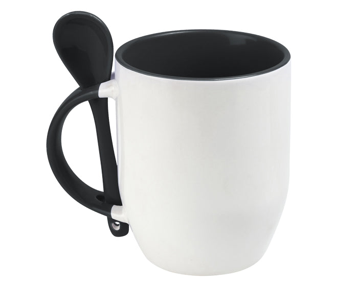 taza para sublimación con cuchara, asa e interior de color. cap. 350 ml. (12 oz). presentación: caja en color blanco.