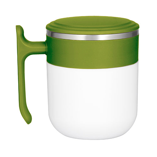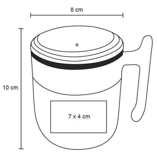termo de doble pared con interior de acero inoxidable y exterior de plástico, tapa de cierre a presión y asa de plástico.