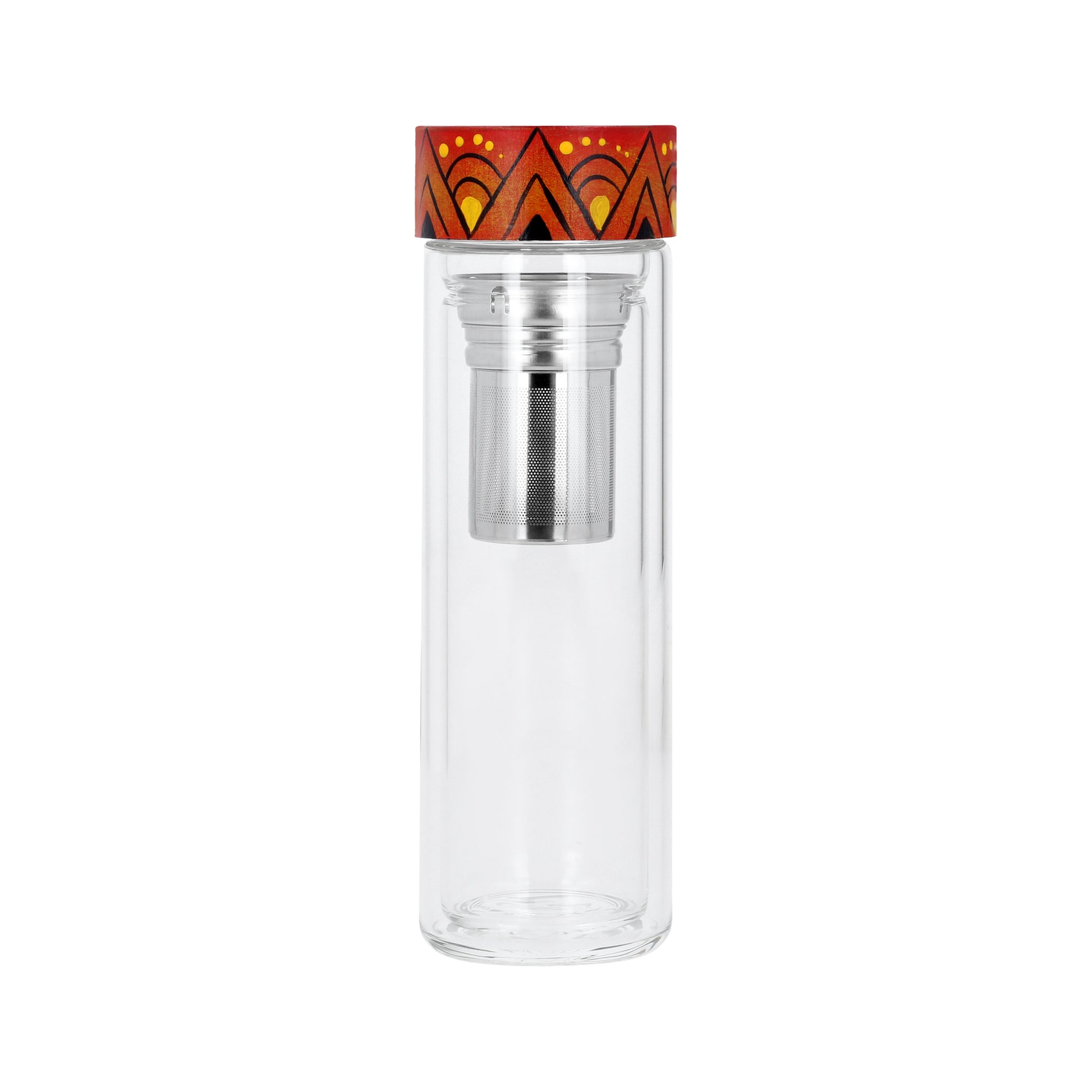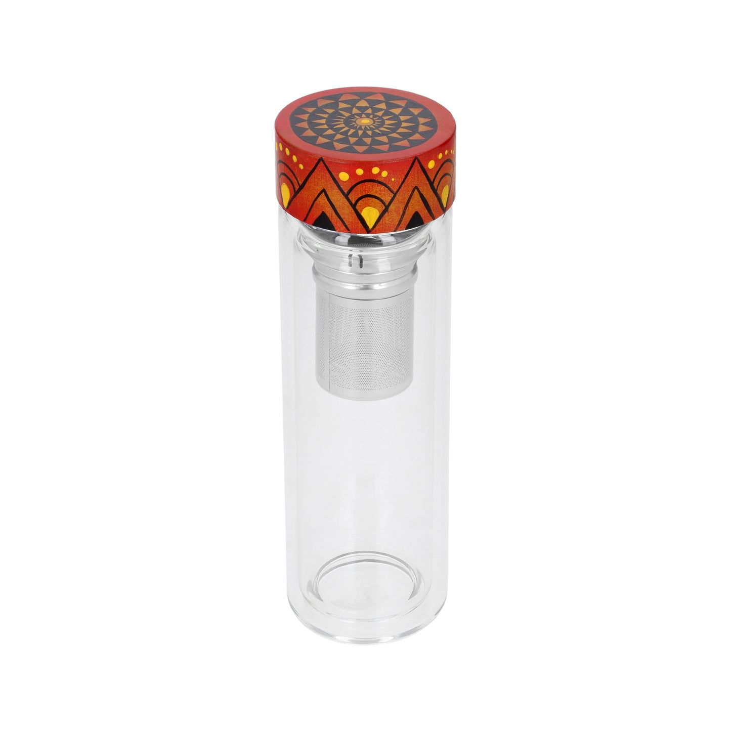 termo con doble pared de vidrio, infusor de metal y tapa enroscable de bambú. edición alebrije.