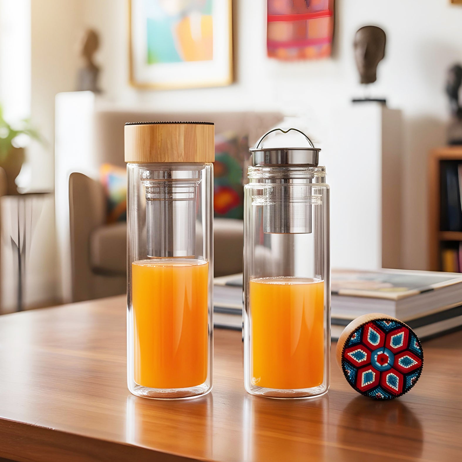termo de vidrio con doble pared e infusor metálico, con tapa de bambú decorada con arte huichol. cada pieza está elaborada a mano con 890 chaquiras colocadas una a una por artesanos de jalisco. con cada compra apoyas el trabajo que representa el sustento económico de estas familias artesanas.