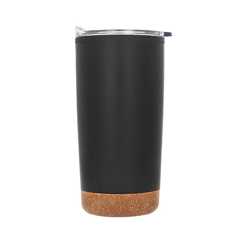 termo con doble pared de acero inoxidable e interior de plástico, base de corcho, tapa traslúcida a presión con seguro deslizable y boquilla.