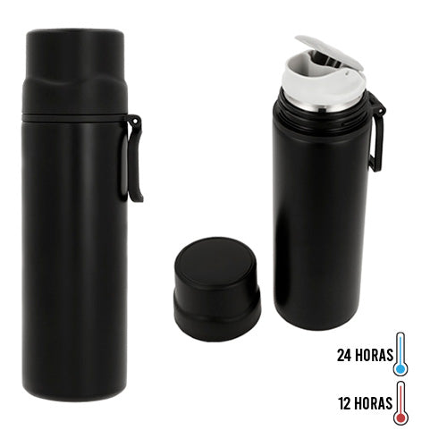 termo de acero inoxidable y doble pared insulado al vacío con tapa de seguridad la cual puede ser utilizada como taza.
