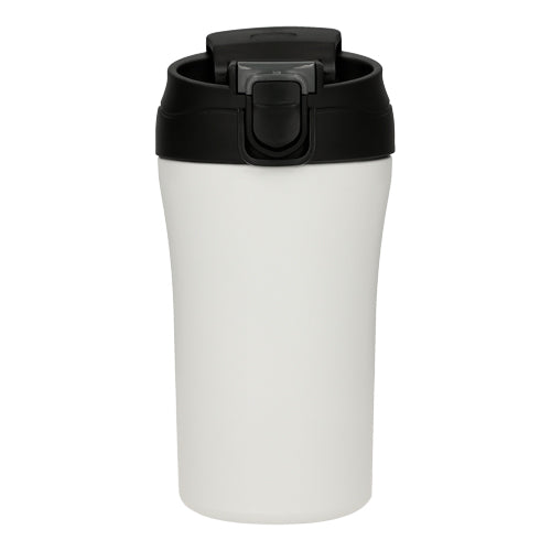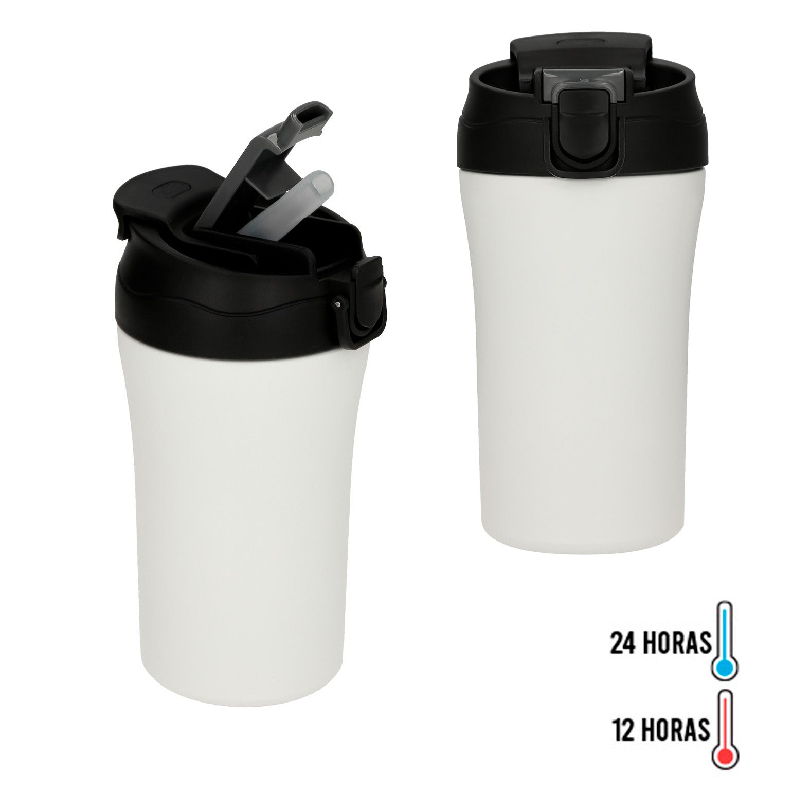 termo de acero inoxidable y doble pared insulado al vacío de acabado rugoso. cuenta con tapa de doble funcionalidad (boquilla normal para bebidas calientes y popote con protector y seguro para bebidas frías).