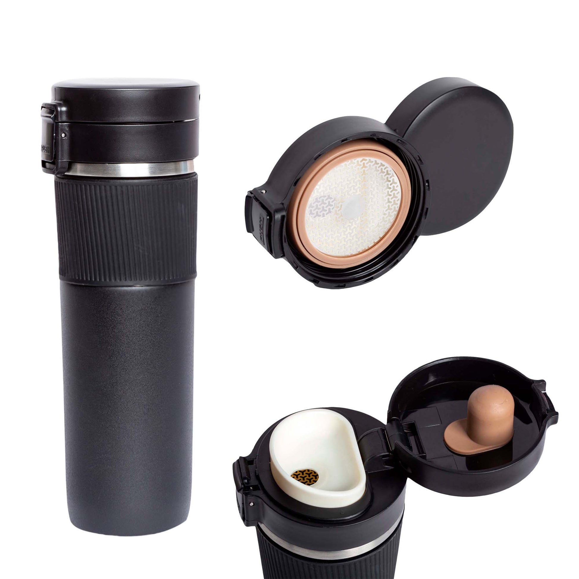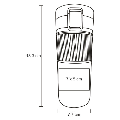 termo de acero inoxidable, insulado al vacío, con tapa enroscable, botón con candado de seguridad y cintillo de silicón.