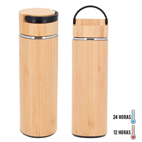 termo insulado al vacío con acabado de bambú, doble pared de acero inoxidable, rejilla metálica y tapa enroscable con asa de plástico.
