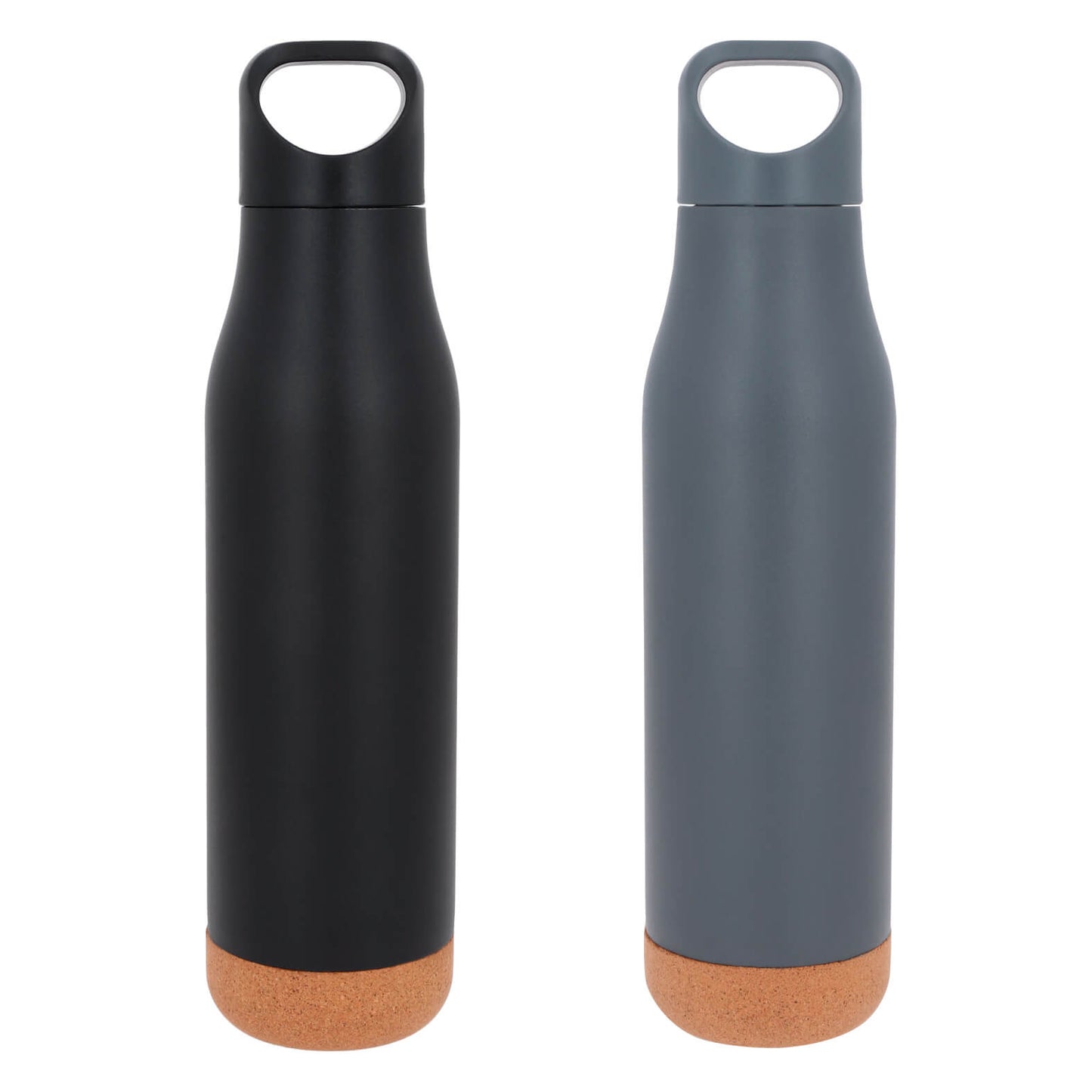 termo con doble pared de acero inoxidable, insulado al vacío, acabado rugoso, base de corcho, y tapa enroscable con asa. cap. 500 ml.
