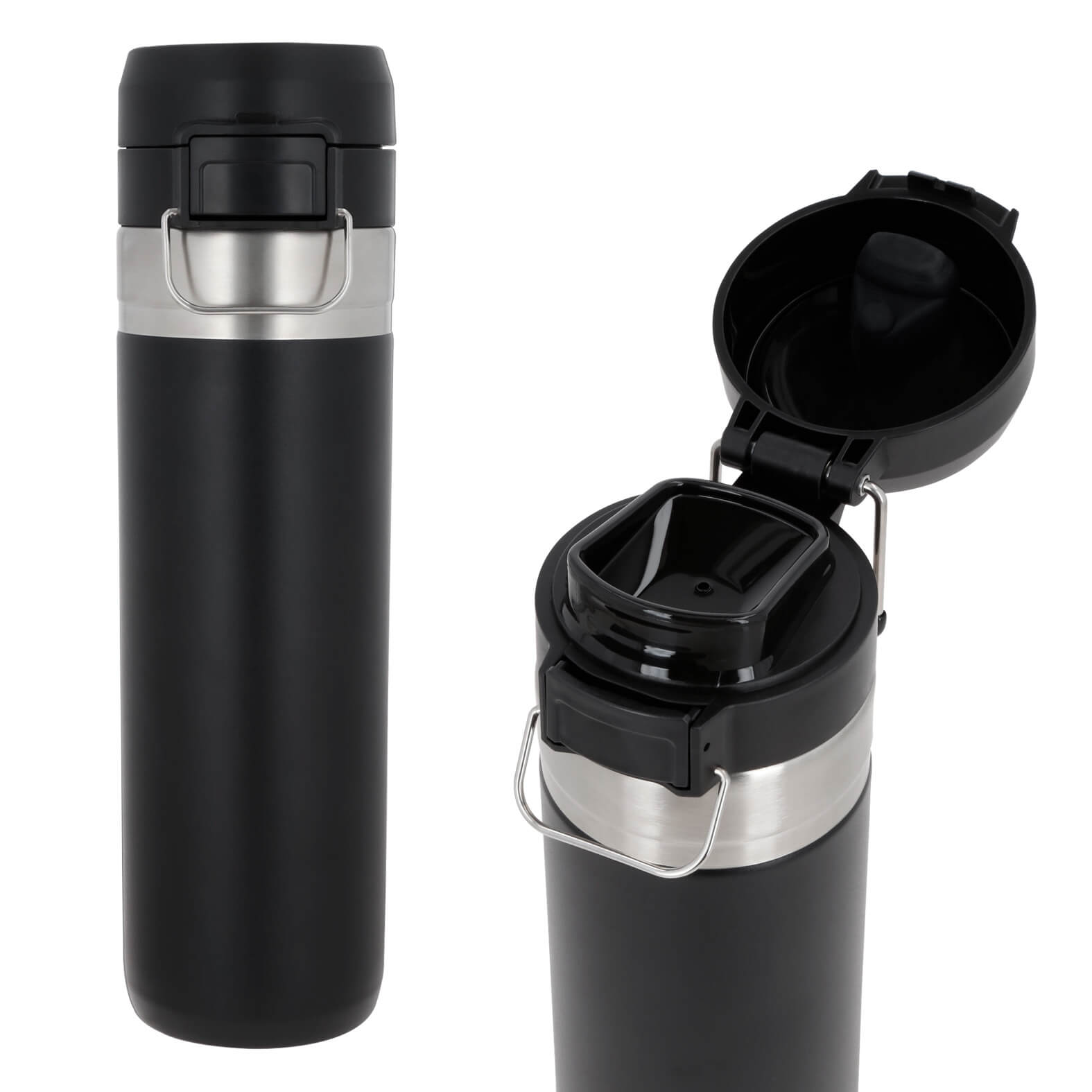 termo con acabado rugoso, doble pared de acero inoxidable, insulado al vacío, tapa enroscable con candado de seguridad y asa metálica.