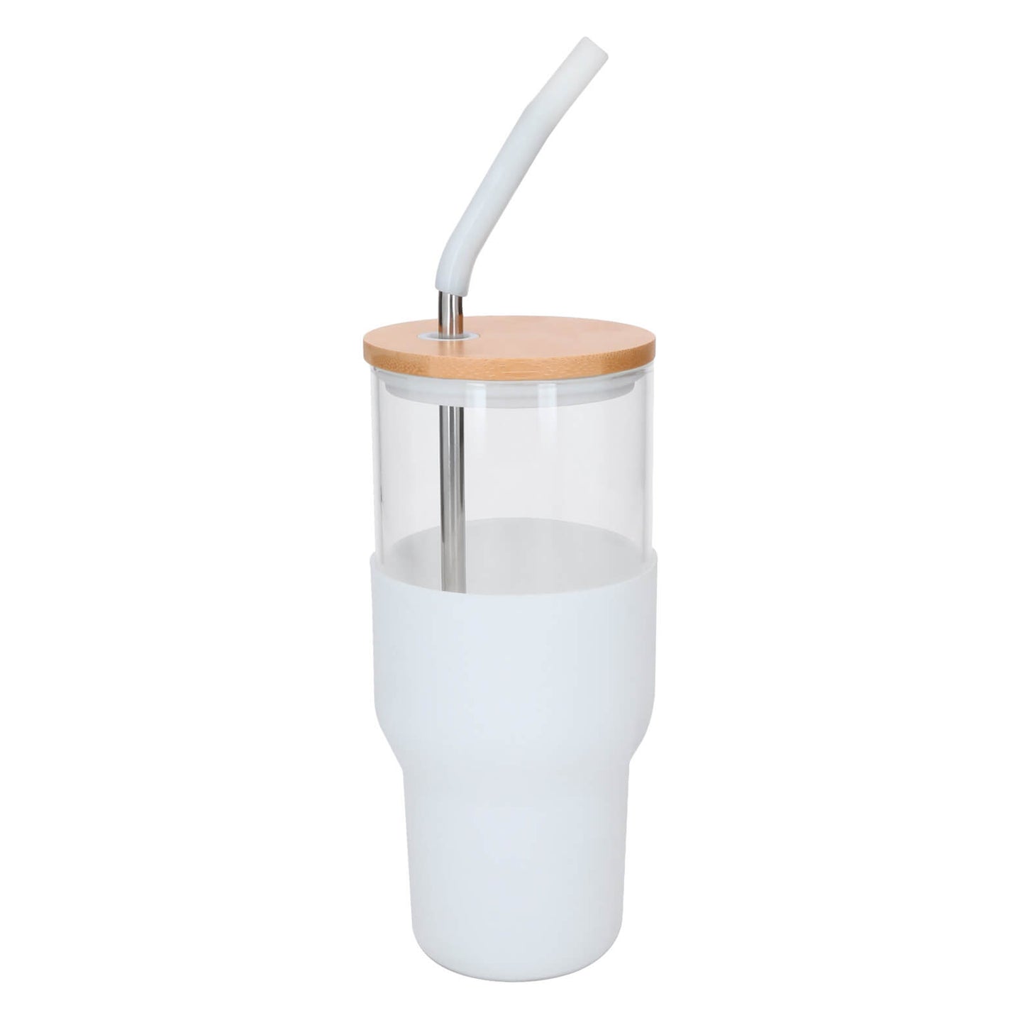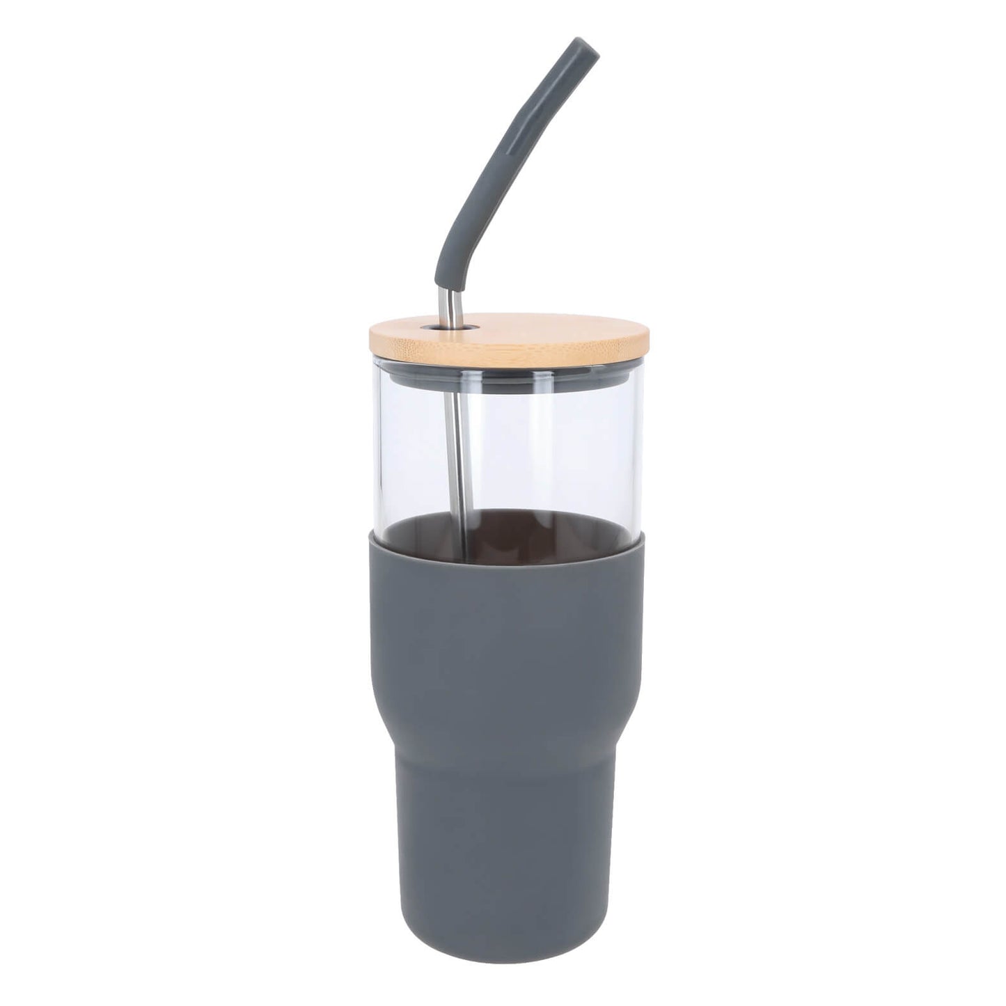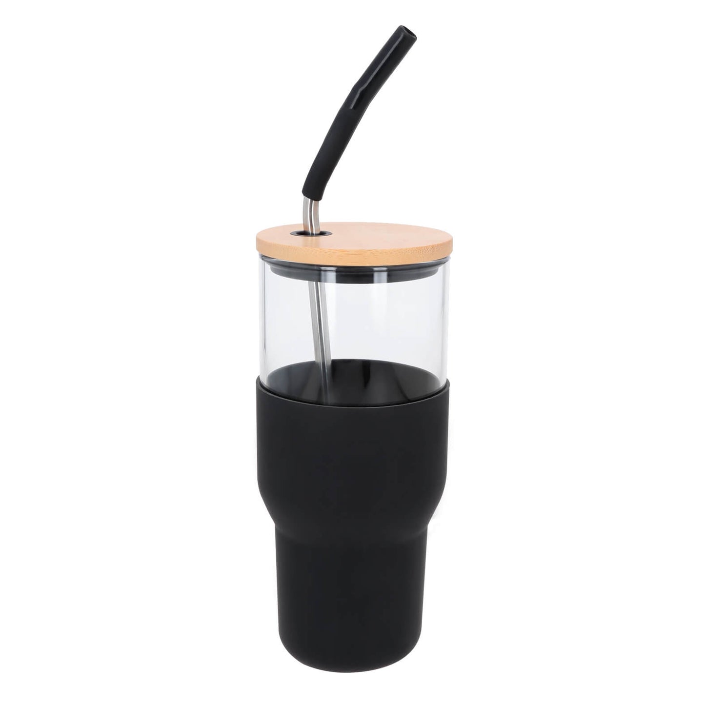 cilindro de vidrio con funda de silicón, tapa de bambú con cierre a presión y popote metalico con boquilla de silicón.
