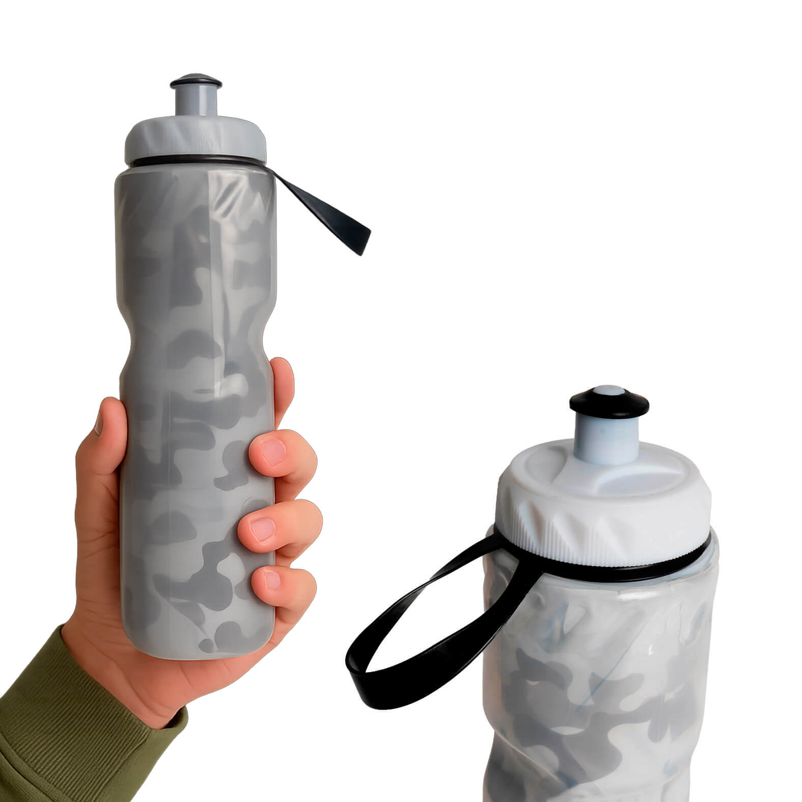 cilindro de plástico con diseño militar, asa y tapa enroscable con chupon.