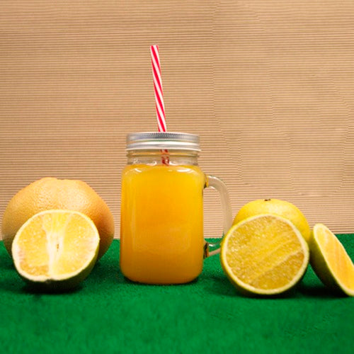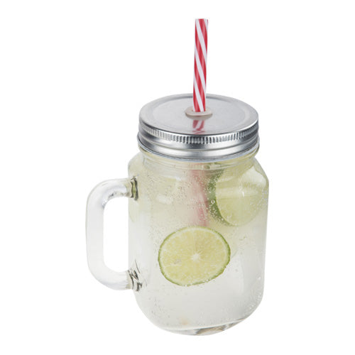 vaso de vidrio con asa y tapa metálica. incluye popote rígido.
