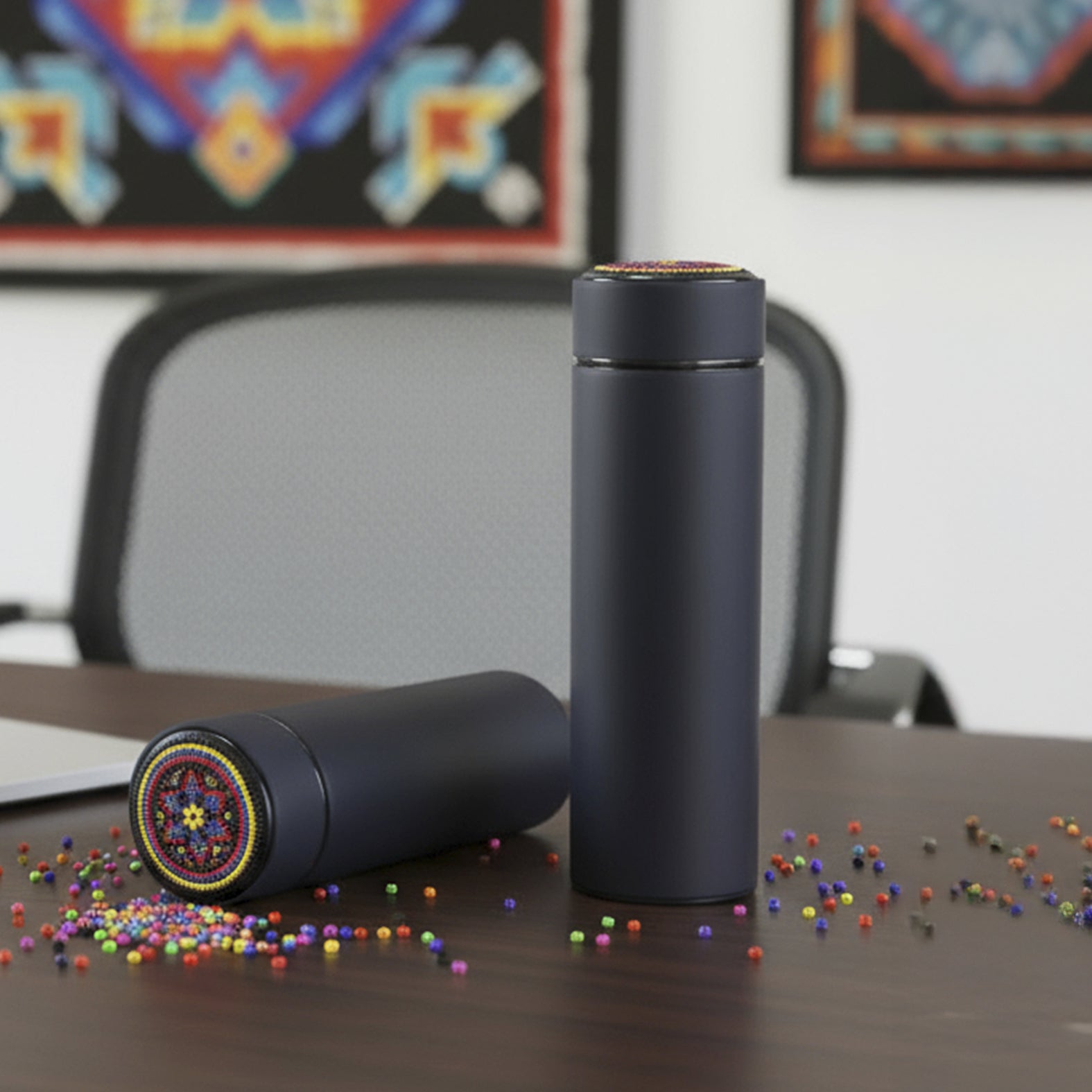 termo de acero inoxidable con doble pared aislada al vacío e infusor metálico, con técnica huichol en chaquira. cada pieza está elaborada a mano con 800 chaquiras colocadas una a una por artesanos de jalisco. con cada compra apoyas el trabajo que representa el sustento económico de estas familias artesanas.