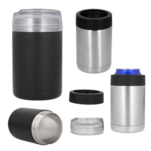 porta latas con doble pared de acero inoxidable y tapa enroscable de plástico transparente con aditamento para convertirse en termo.