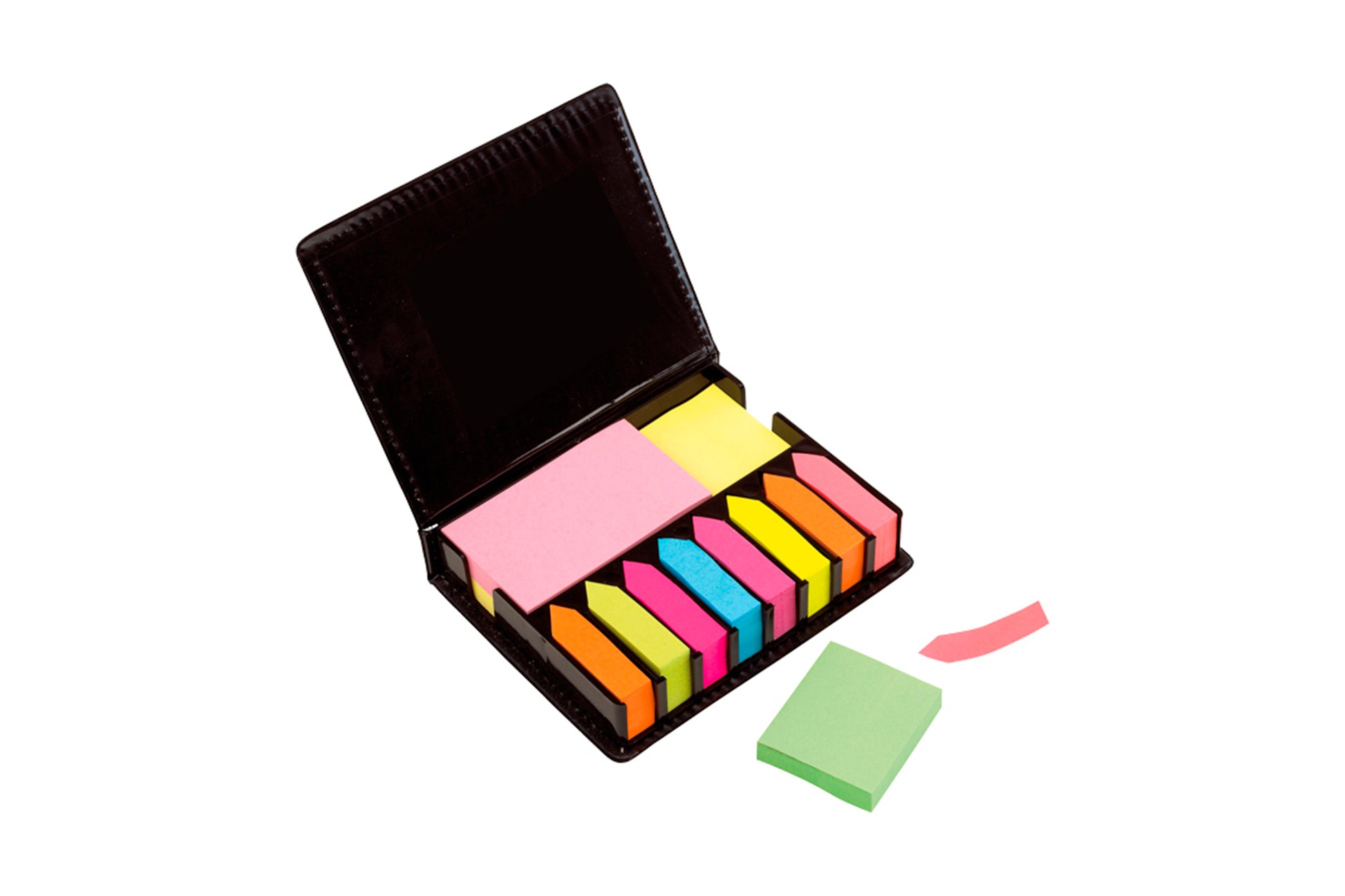 12,6 x 2,8 x 10,5 cm. curpiel negra. 8 blocs autoadhesivos de diferente color en forma de flecha. 2 blocs autoadhesivos rectangulares de diferente color. 2 blocs autodhesivos cuadrados de diferente color.