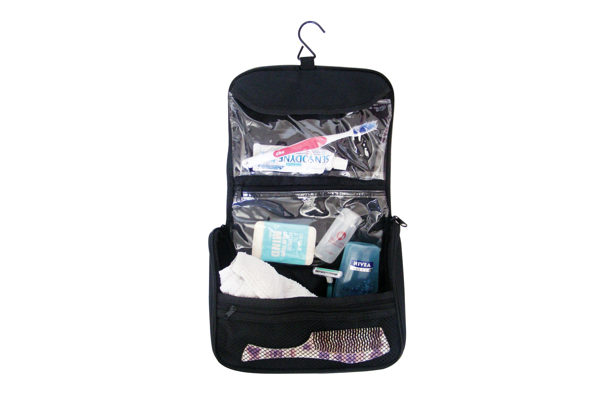 25,5 x 19 x 8 cm. polyester 600d. colgante, con manija para transportar, cierre de apertura completa, 2 compartimentos internos plásticos transparentes, 2 bolsillos internos de red y 1 compartimento interno inferior.