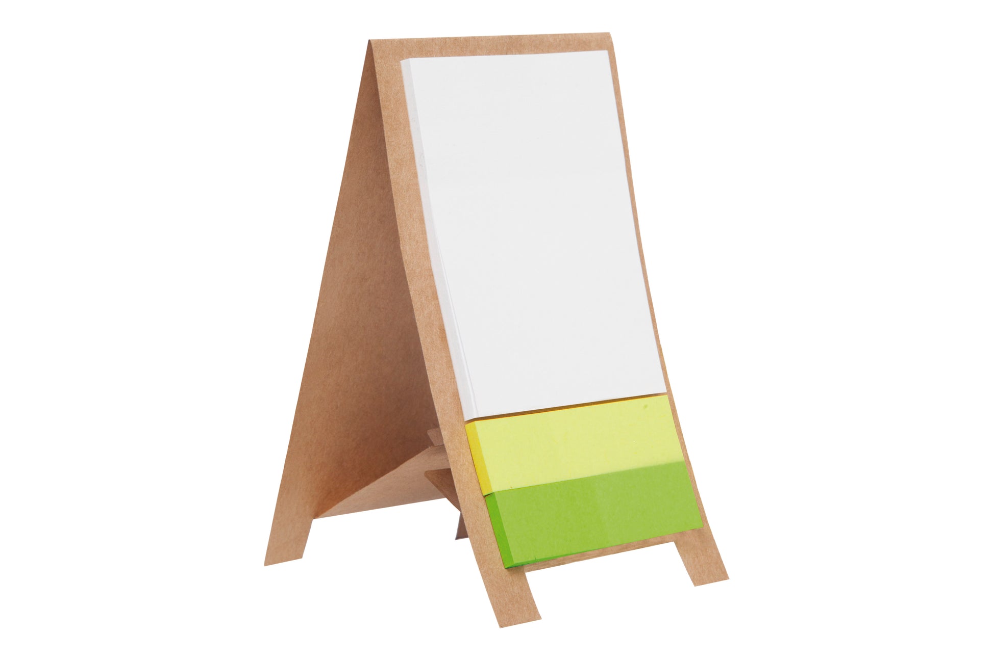 10 x 5,5 x 0,2 cm. cartón. material reciclado. contiene 3 blocks autoadhesivos: 2 pequeños de color y 1 rectangular blanco.