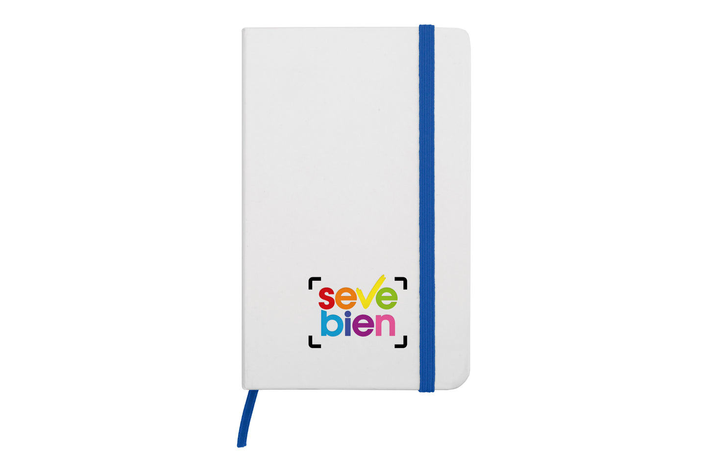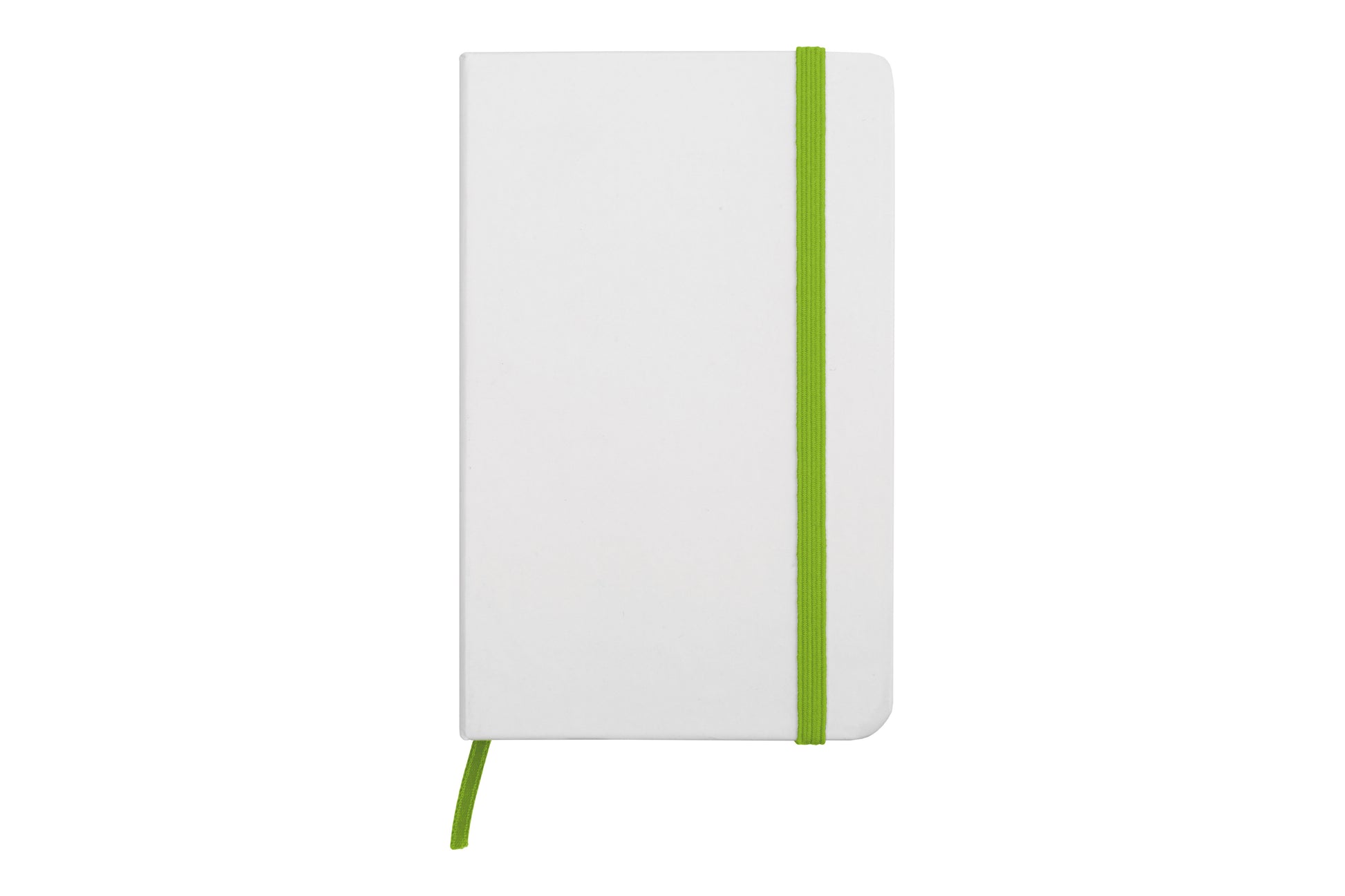 14,3 x 9,2 x 1,1 cm. cartón. libreta de pasta dura color blanco. contiene 80 hojas rayadas, separador de tela. cierra con banda elástica de color.
