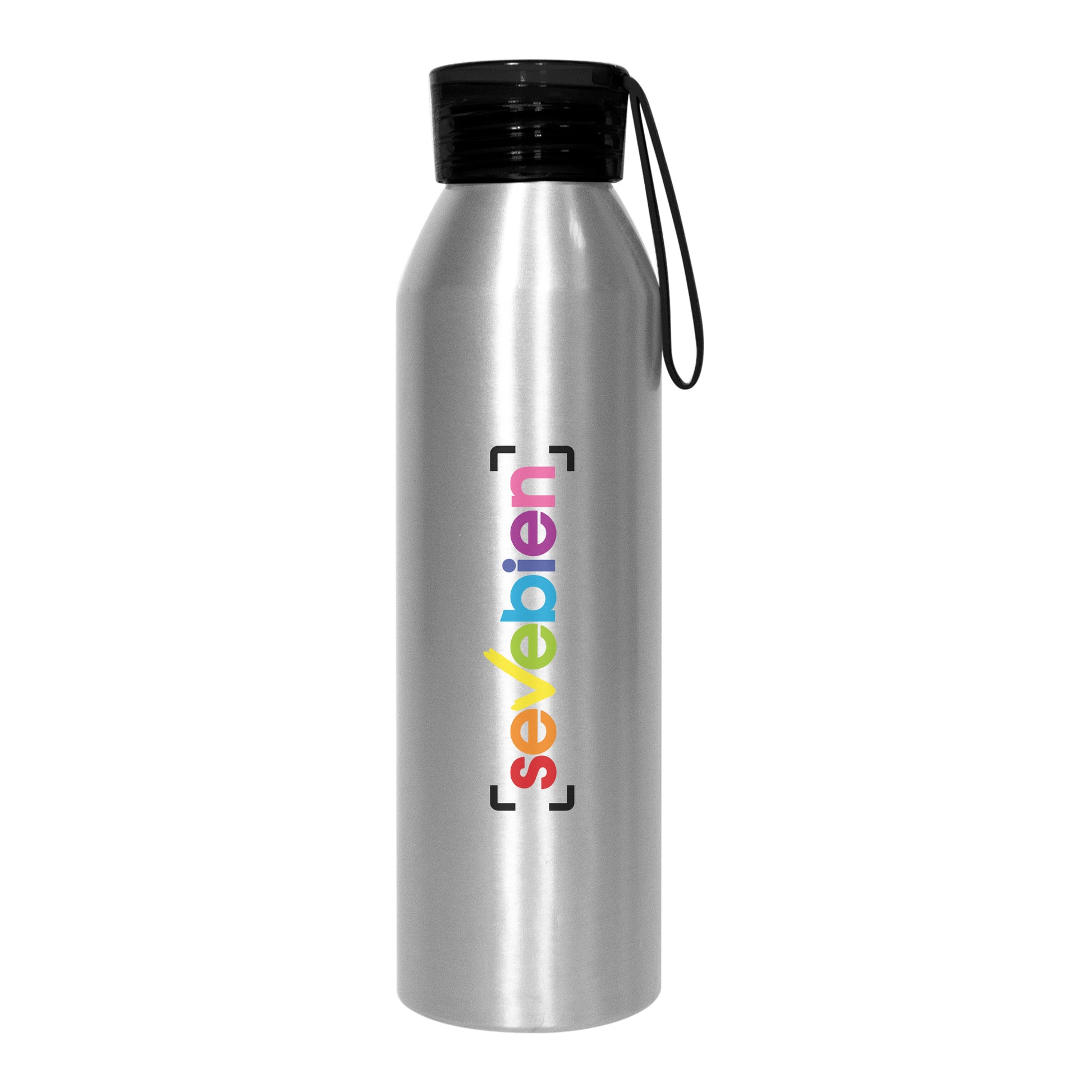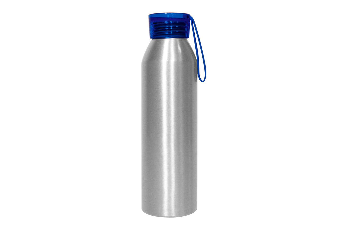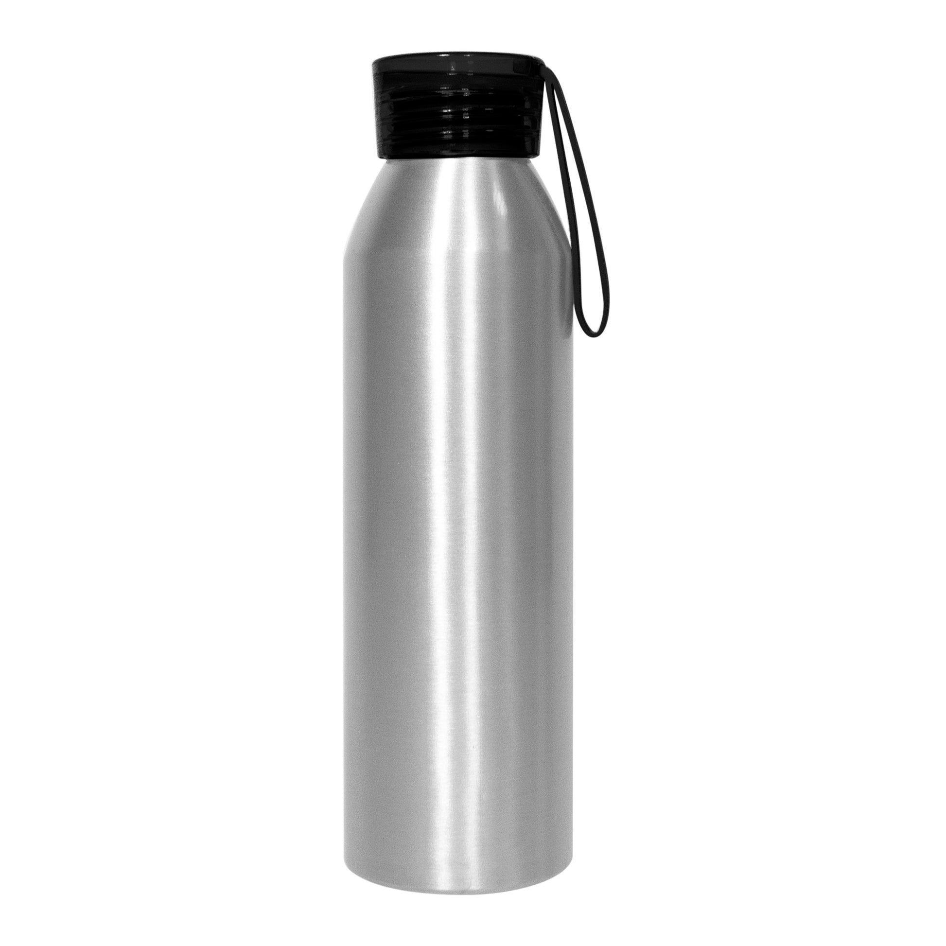 Ø 6,6 x 23 cm. capacidad 600 ml. aluminio. cuerpo color plata, tapa de color traslucida con tira de silicona (de 8 cm) del mismo color. ideal para hidratarte todos los días. presentación en caja de regalo.