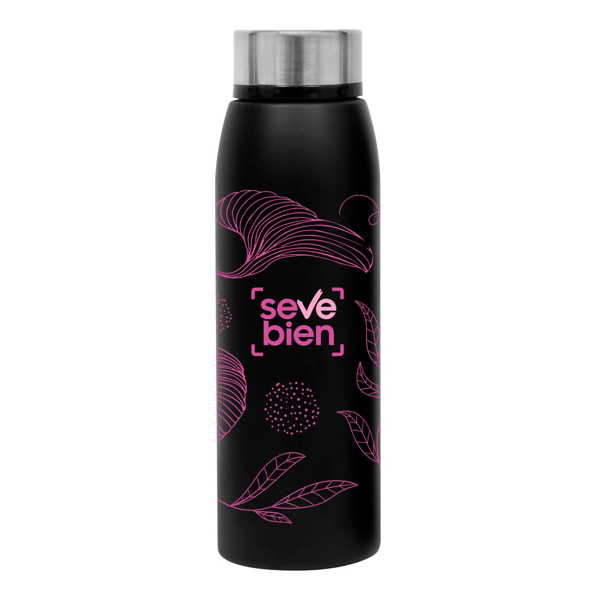 Ø 7 x 23,5 cm. capacidad 500 ml. botella doble pared, sellada al vacío. interior de acero 304 y exterior de acero 201. cuerpo color negro y tapa a rosca de acero. mantiene hasta 12 hs la temperatura de las bebidas calientes y 24 hs de las bebidas frías. presentación en caja de regalo.