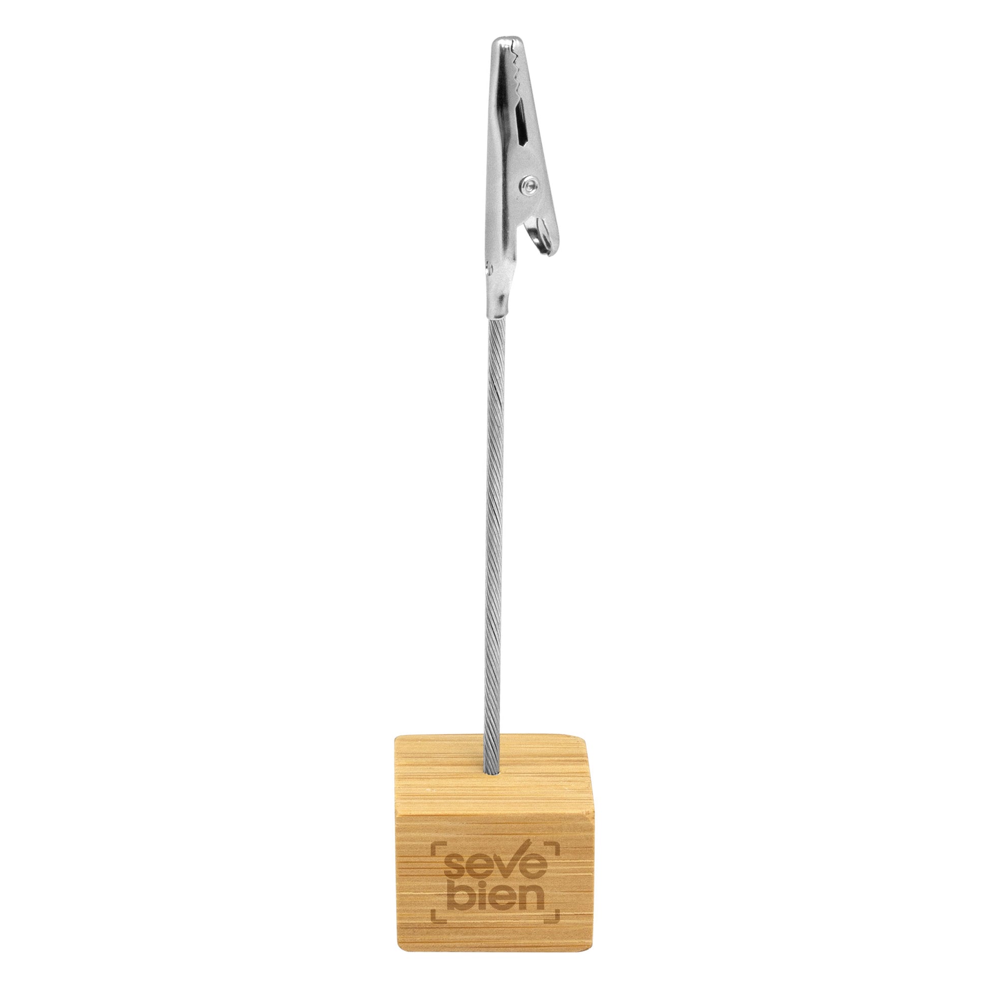 2,5 x 2,5 x 2,5 cm. alto 11,5 cm bambú y metal. memo clip de escritorio con base cúbica en bambú. broche pinza cocodrilo de metal. práctico, útil y transportable.