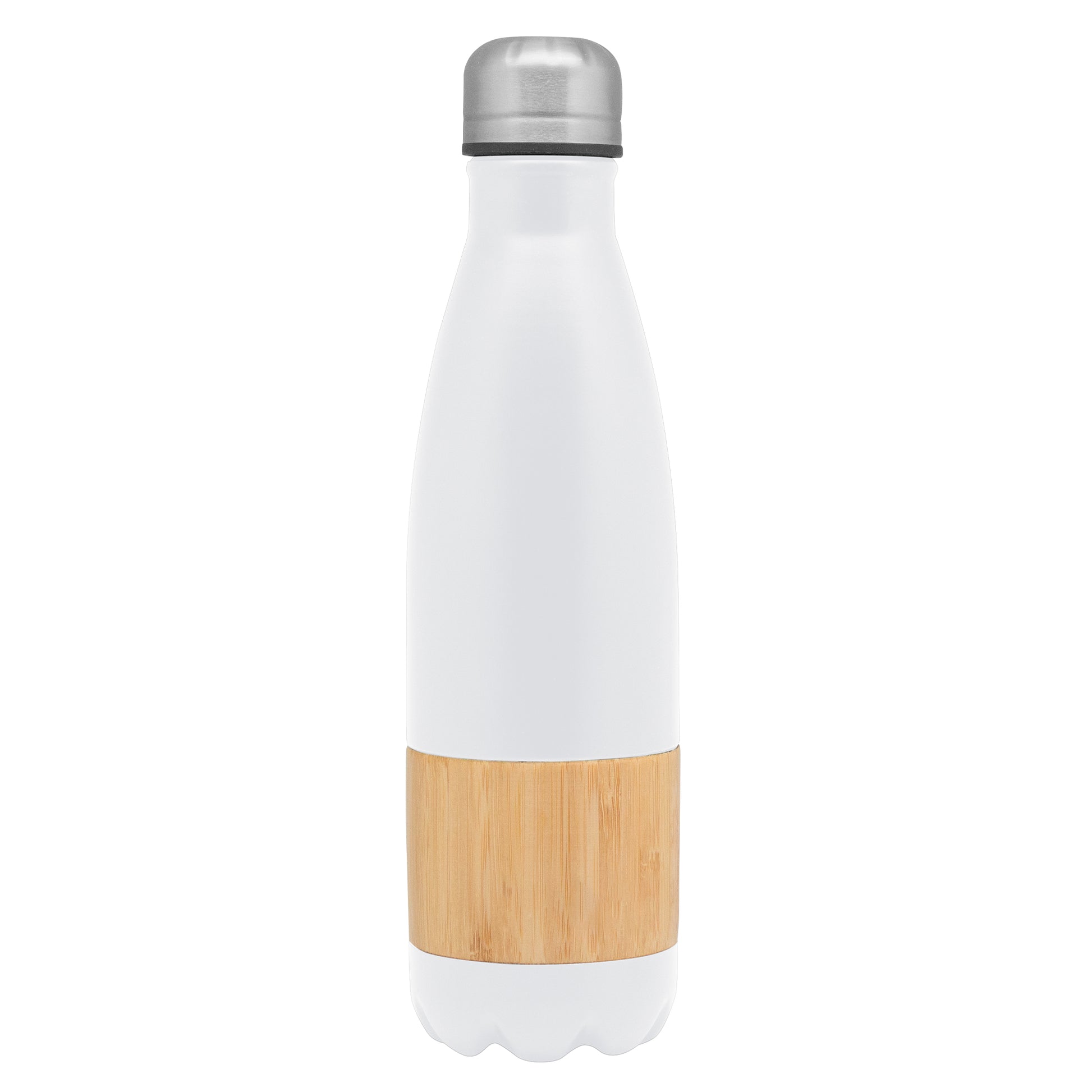 Ø7,4 x 26,8 cm. capacidad 500 ml. acero inoxidable. botella doble pared, sellada al vacío. interior en acero 304 y exterior en acero 201, con detalles de bambú. tapa de acero. mantiene hasta 12 hs la temperatura de las bebidas calientes y 24 hs de las bebidas frías. presentación en caja de regalo kraft.