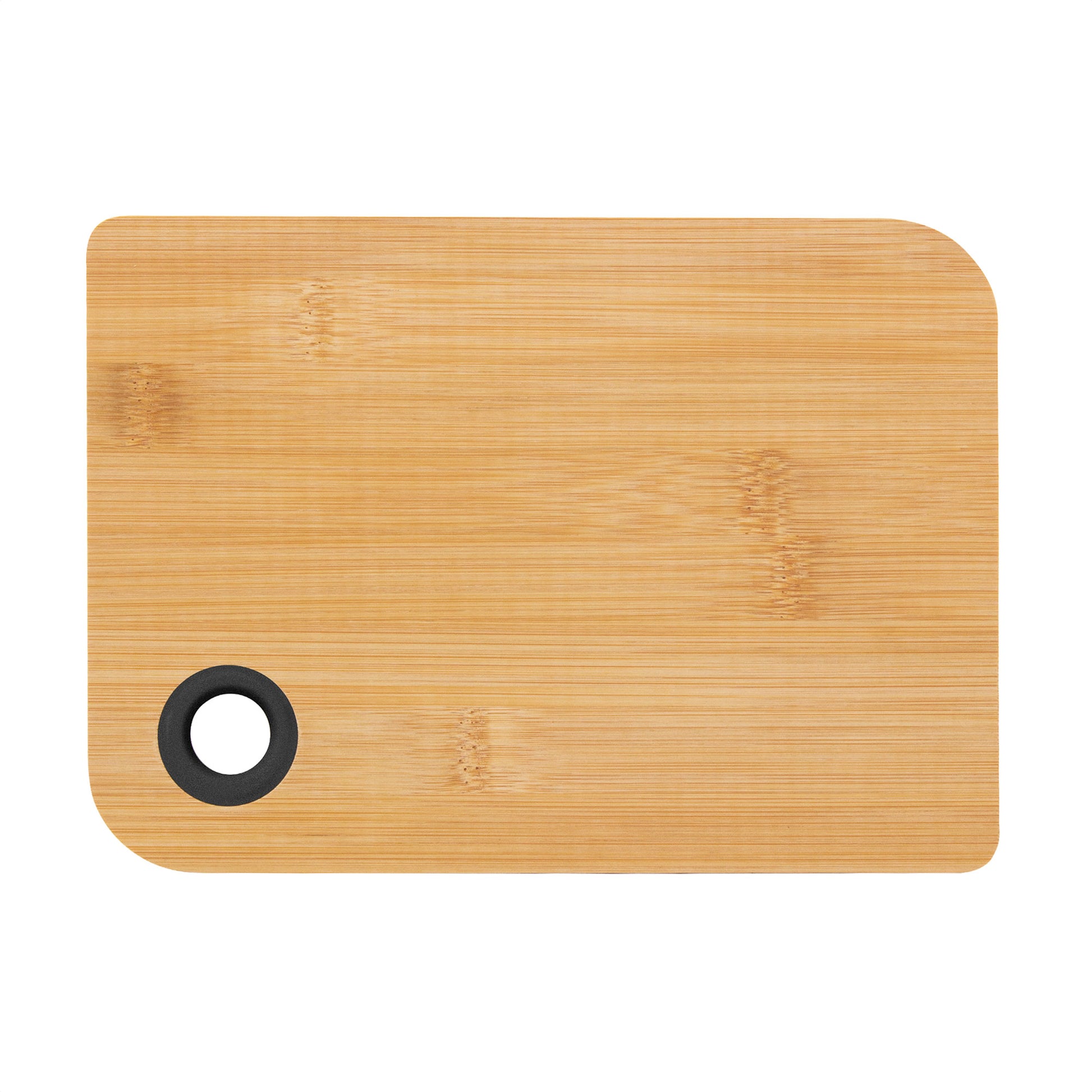 24,7 x 17,5 x 1 cm. bambú y silicona . tabla de bambú con anillo de silicona color negro para colgar y trasladar. tabla para cortar y presentar diferentes quesos, fiambres y embutidos. presentación en caja de regalo kraft.