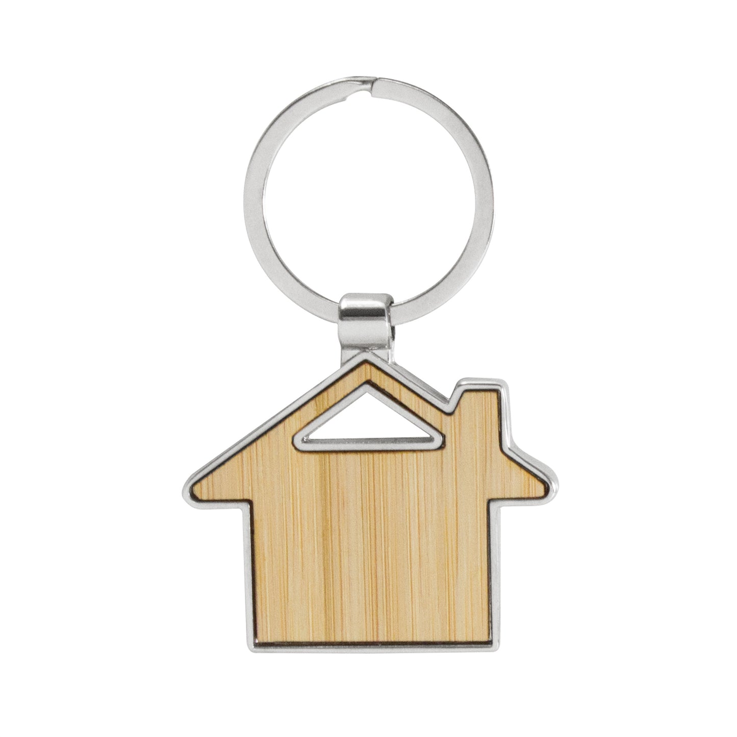 calidez en tus llaves. llavero con forma de casa. estructura metálica con aleación de zinc con acabado brillante y panel frontal de bambú barnizado.