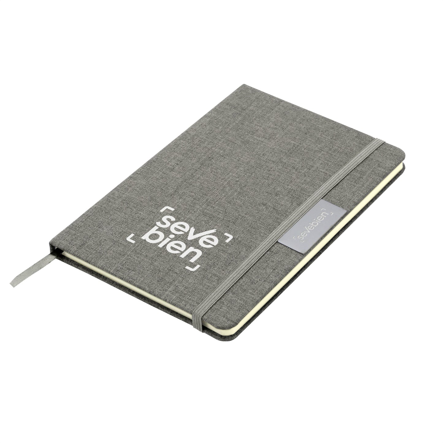 sostenibilidad elegante.libreta con placa metálica. tapa de cartón de 300g recubierta en rpet 310. placa metálica de 5 x 2 cm. interior de 80 hojas rayadas en papel obra de 70g. encuadernación cosida. cierre con banda elástica del mismo color de la tapa.