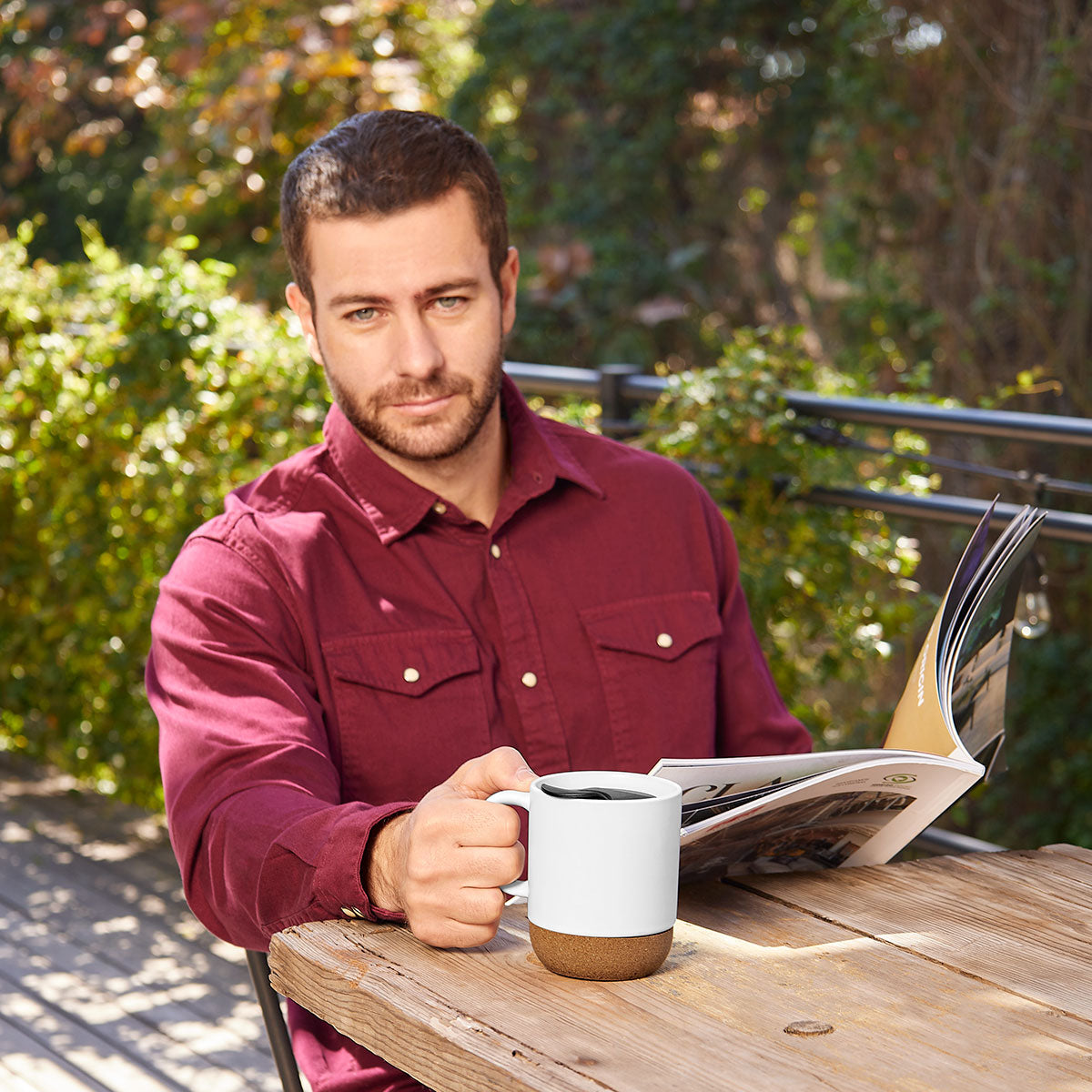 taza de cerámica terminado mate. base de corcho. incluye tapa de plástico con válvula de seguridad.