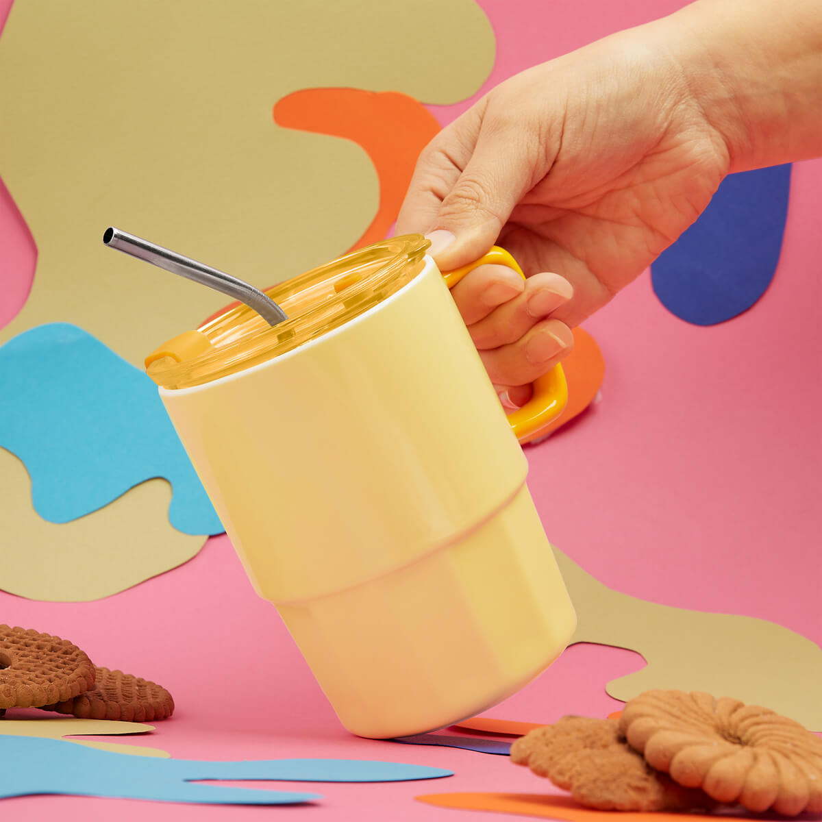 taza de cerámica. incluye tapa de plástico con sistema push, sobretapa deslizable y función adiconal para popote. agrega también, un popote metálico reutilizable. diseñada con colores vibrantes que alegran cualquier ocasión. incluye caja individual de color.