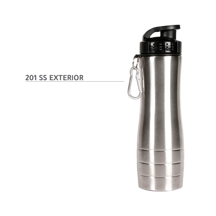cilindro de acero inoxidable con tapa de seguridad fabricada en pp y arnés de aluminio, fabricado en materiales de grado alimenticio, no usar en microondas, capacidad de 750 ml (25 oz). incluye caja de cartón individual.