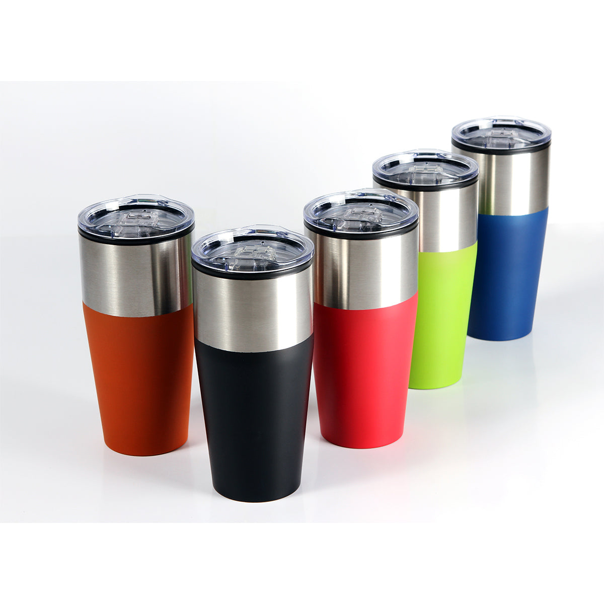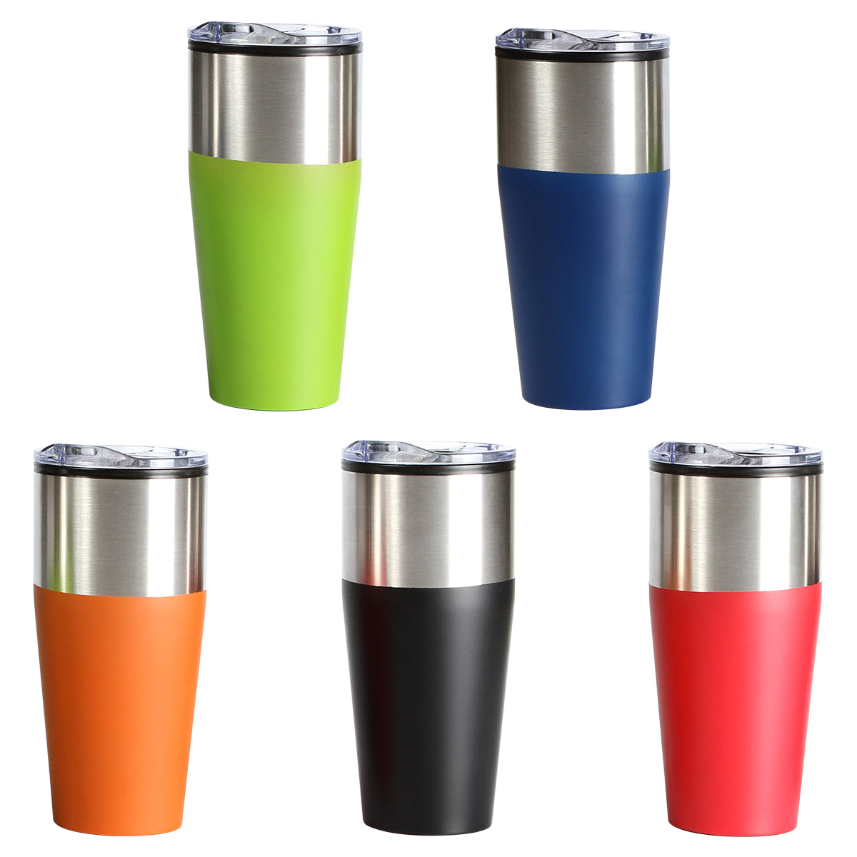termo de acero inoxidable bi-tono con tapa deslizable de plástico transparente, fabricado en materiales de grado alimenticio, mantiene bebidas frías o calientes por un largo tiempo, no usar en microondas. capacidad de 530 ml (18 oz). incluye caja de cartón individual.