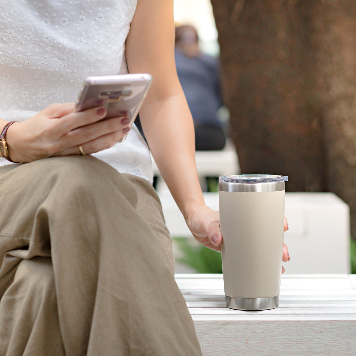 termo de acero inoxidable doble pared con tapa deslizable de plástico transparente, fabricado en materiales de grado alimenticio, mantiene bebidas frías o calientes por un largo tiempo, no usar en microondas, capacidad de 590 ml (20 oz). incluye caja de cartón individual.