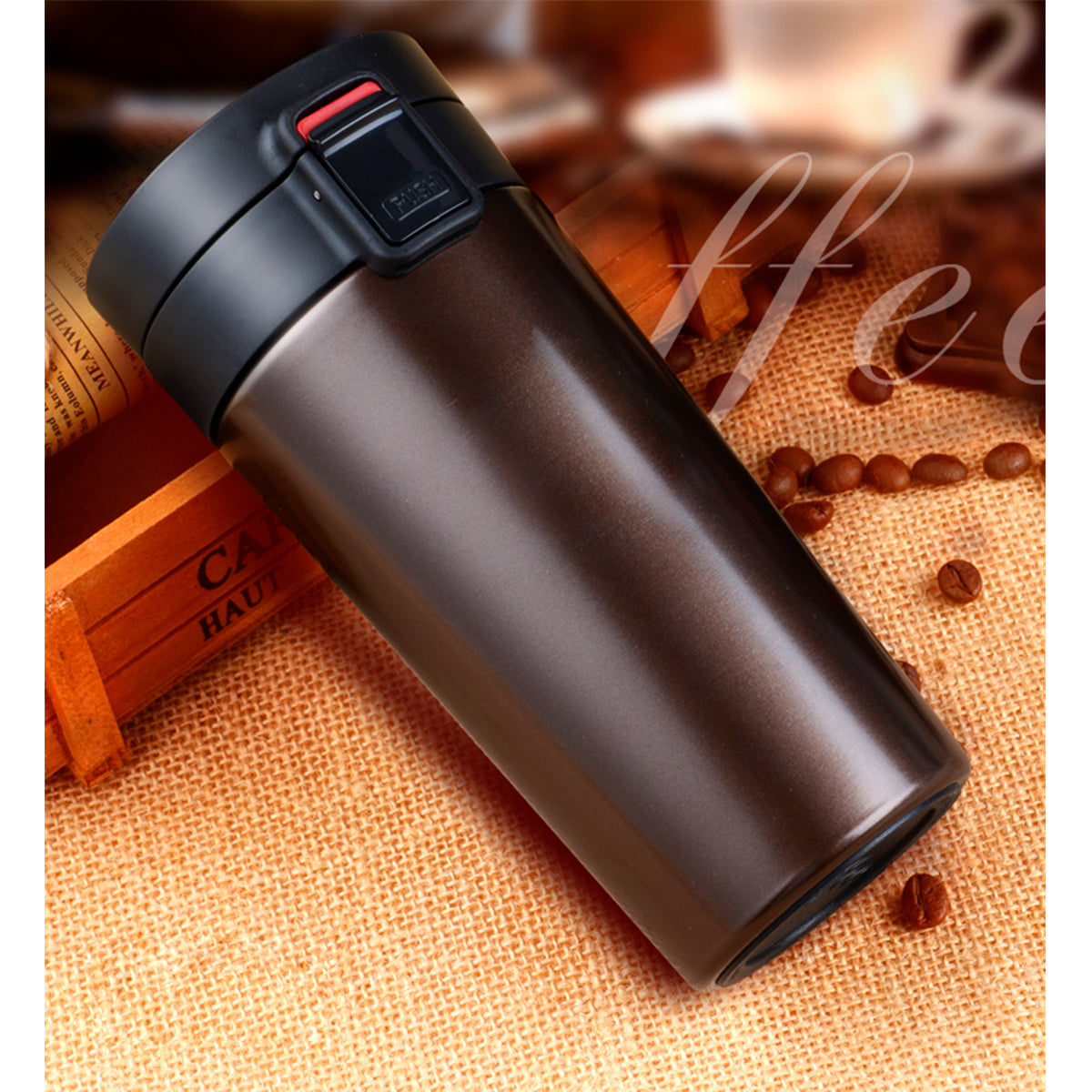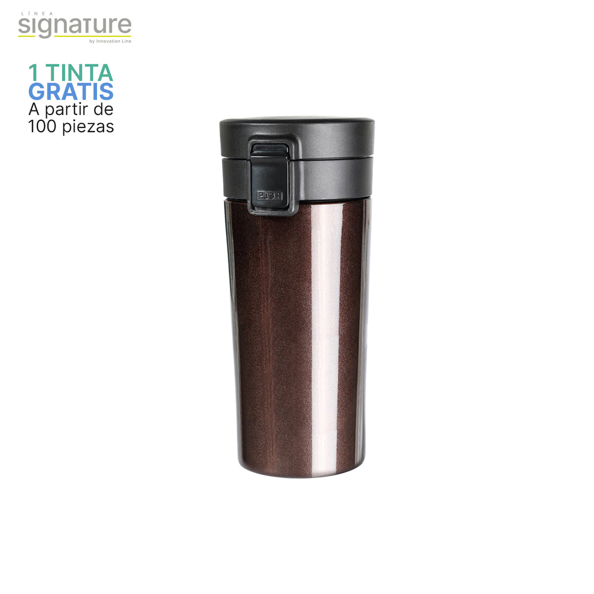 termo de acero inoxidable doble pared con tapa de seguridad y sistema automático de apertura, fabricado en materiales de grado alimenticio, mantiene bebidas frías o calientes por un largo tiempo, no usar en microondas. capacidad de 350 ml (12 oz).