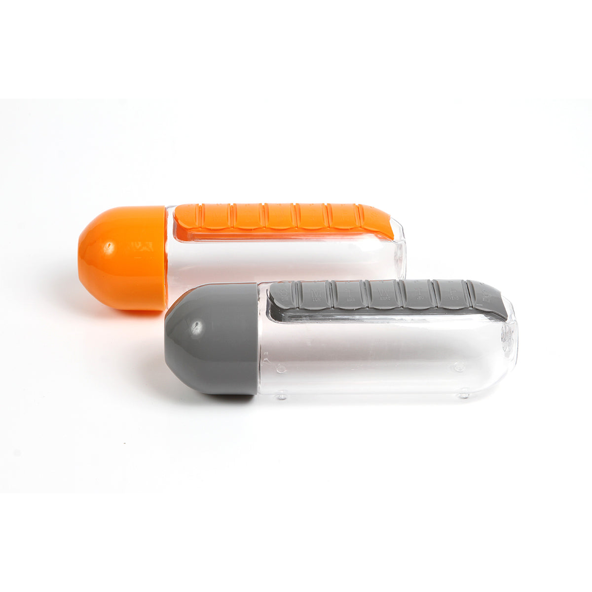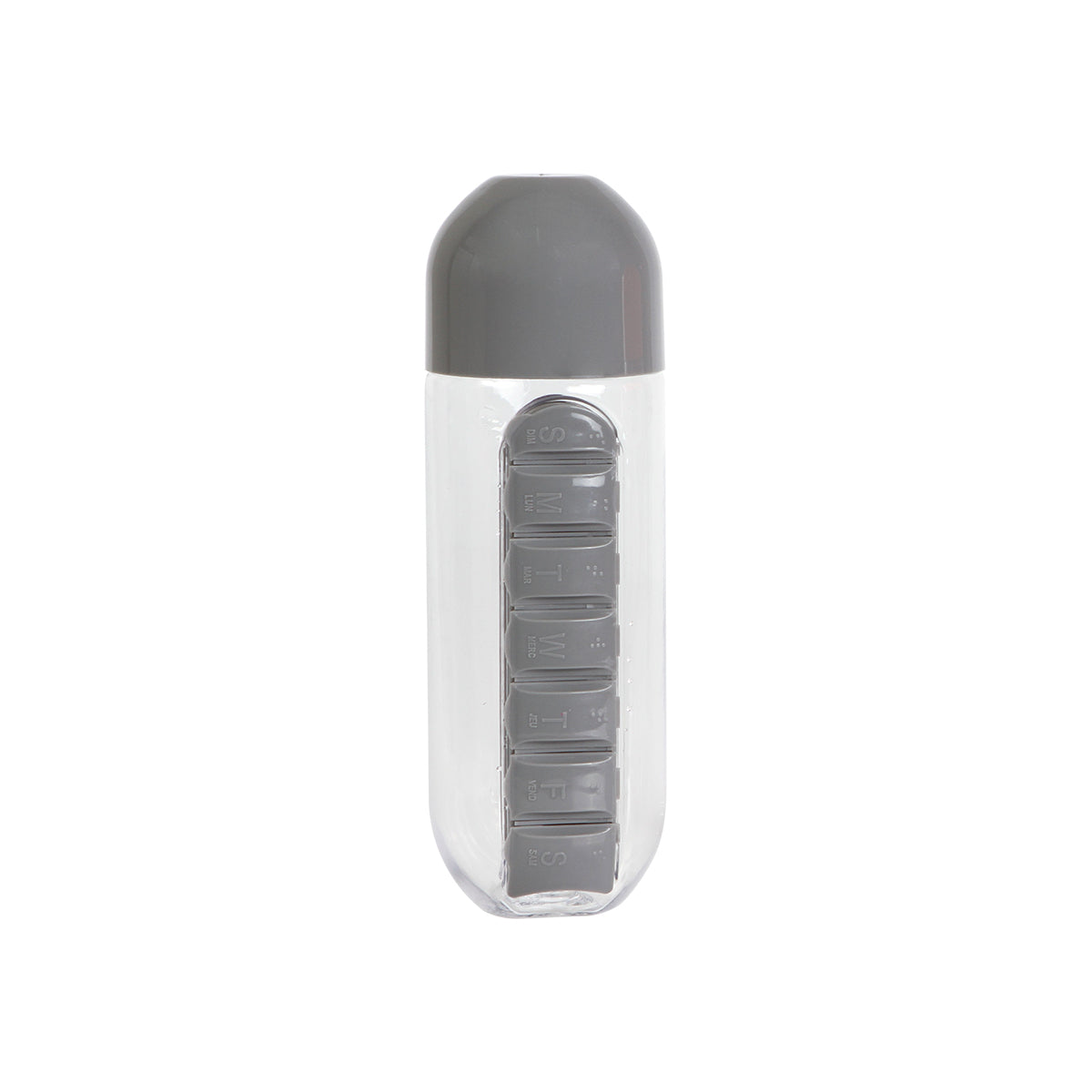 botella fabricada en tritan, pastillero integrado con 7 compartimentos, uno para cada día de la semana, capacidad de 600 ml (20 oz).