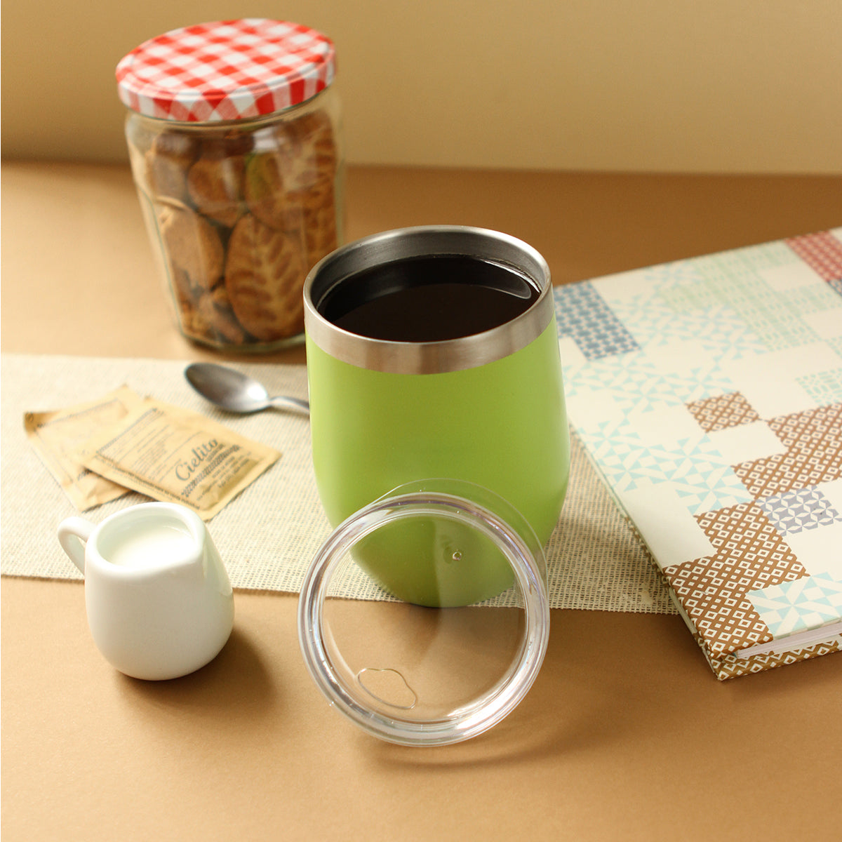vaso de acero inoxidable doble pared con tapa transparente de plástico, mantiene bebidas frías o calientes por un largo tiempo, no usar en microondas, capacidad 350 ml (12oz). incluye caja de cartón individual.