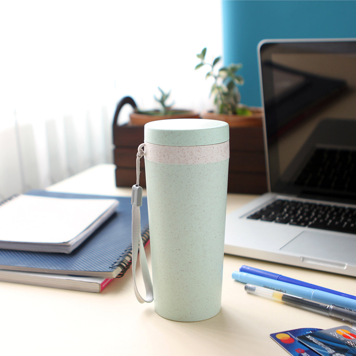 termo doble pared fabricado en material ecológico (fibra de trigo) con tapa de polipropileno con correa para fácil transportación. capacidad de 300 ml. producto biodegradable.