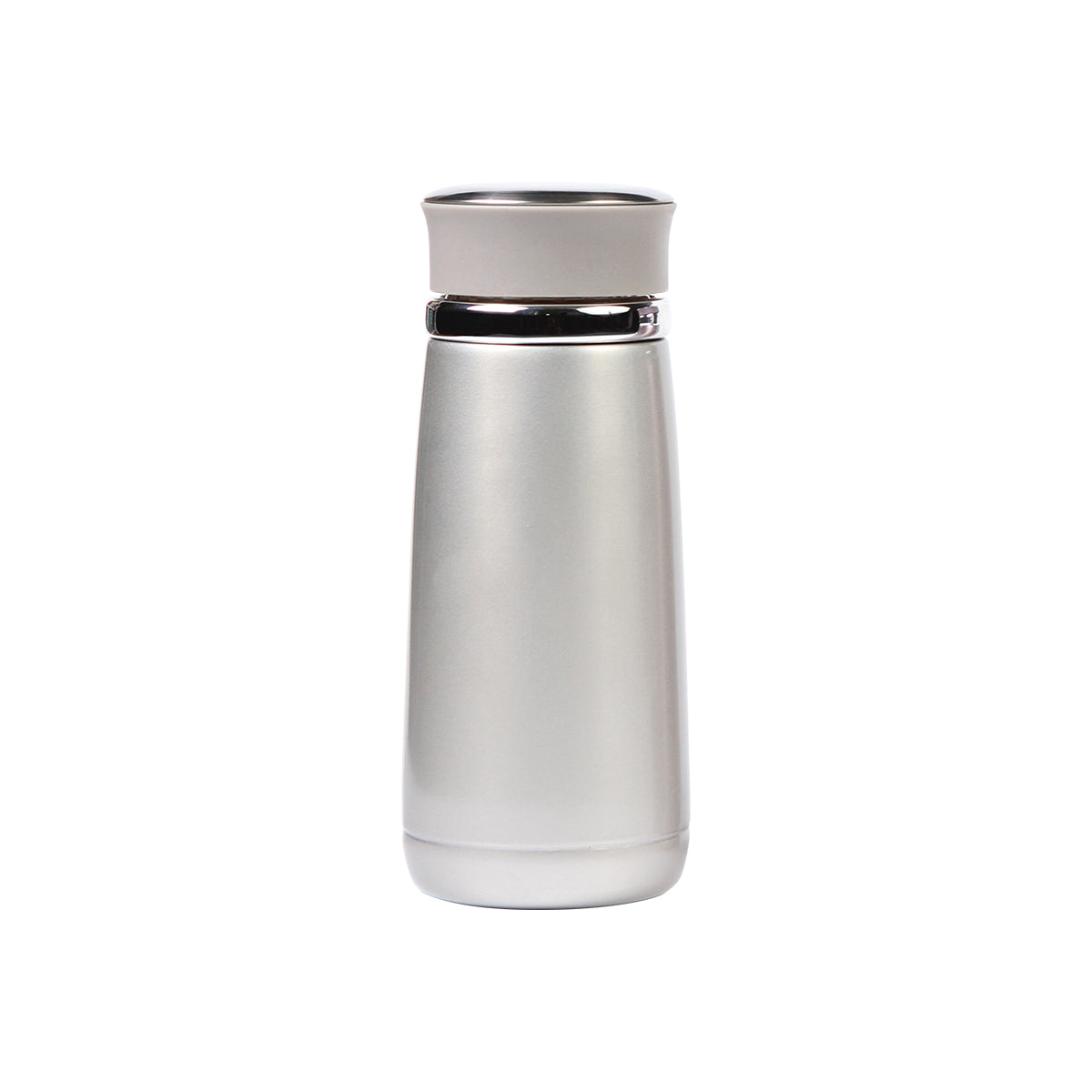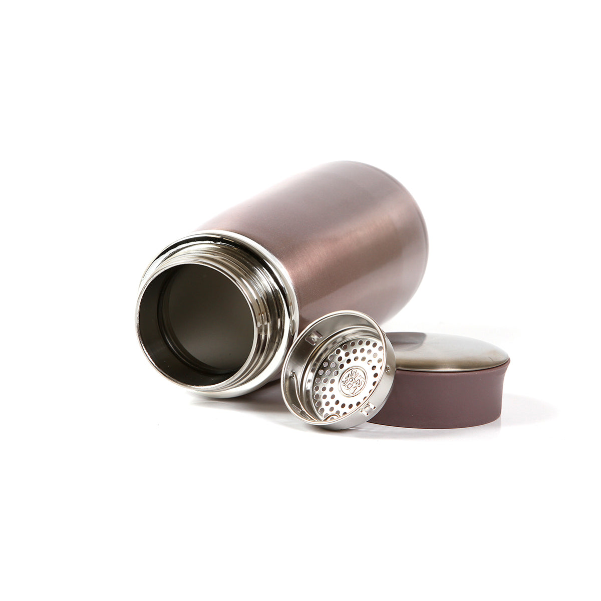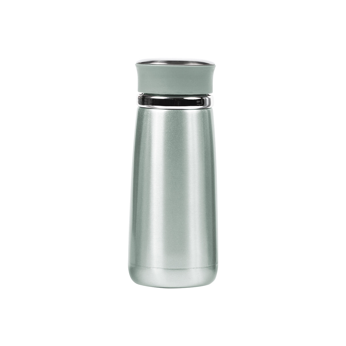 termo de acero inoxidable doble pared con acabado brillante y detalles metálicos, fabricado en materiales de grado alimenticio, mantiene bebidas frías o calientes por un largo tiempo, no usar en microondas. capacidad de 420 ml (14 oz). incluye caja de cartón individual.