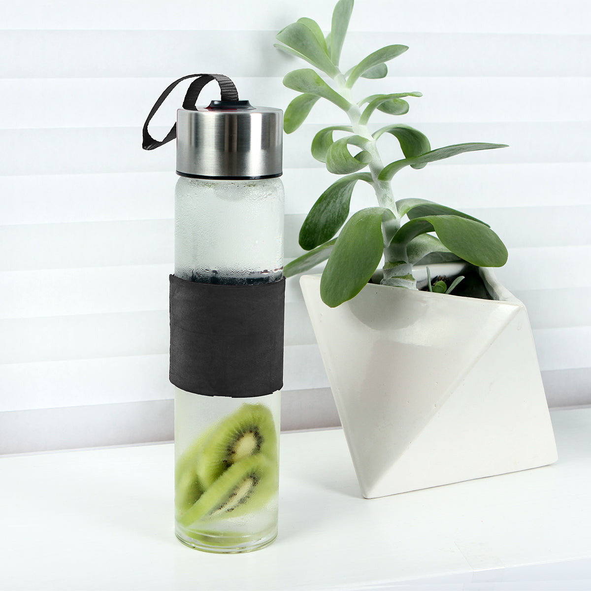 cilindro de cristal de borosilicato con tapa metálica de cierre hermético, correa y manga de poliuretano (pu), fabricado en materiales de grado alimenticio, capacidad 450 ml (15 oz). incluye caja de cartón individual.