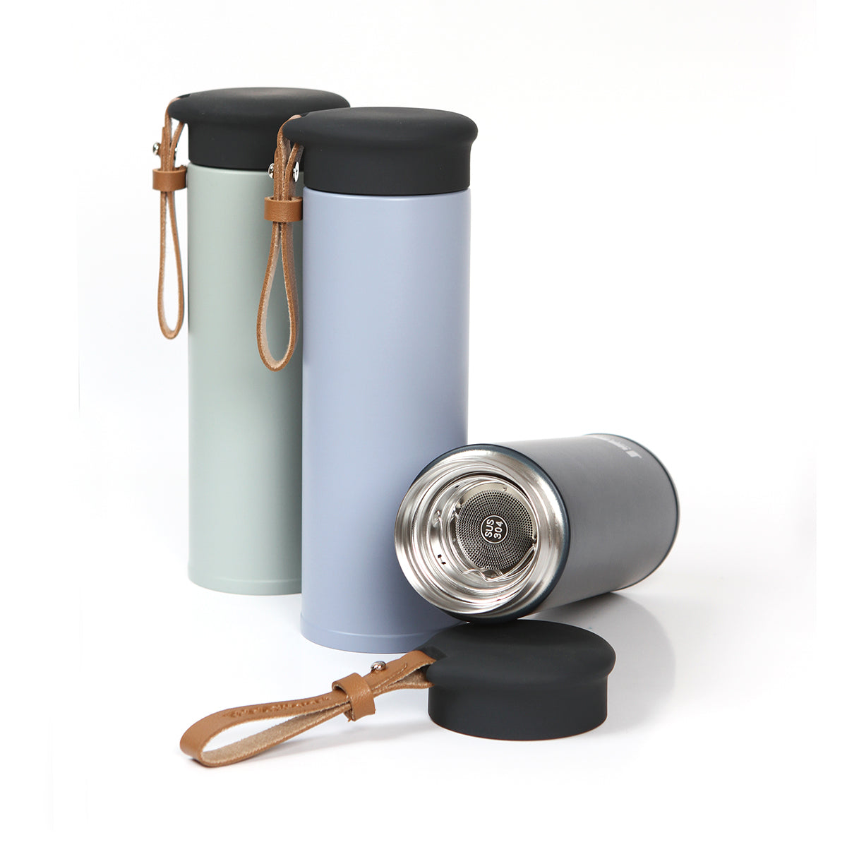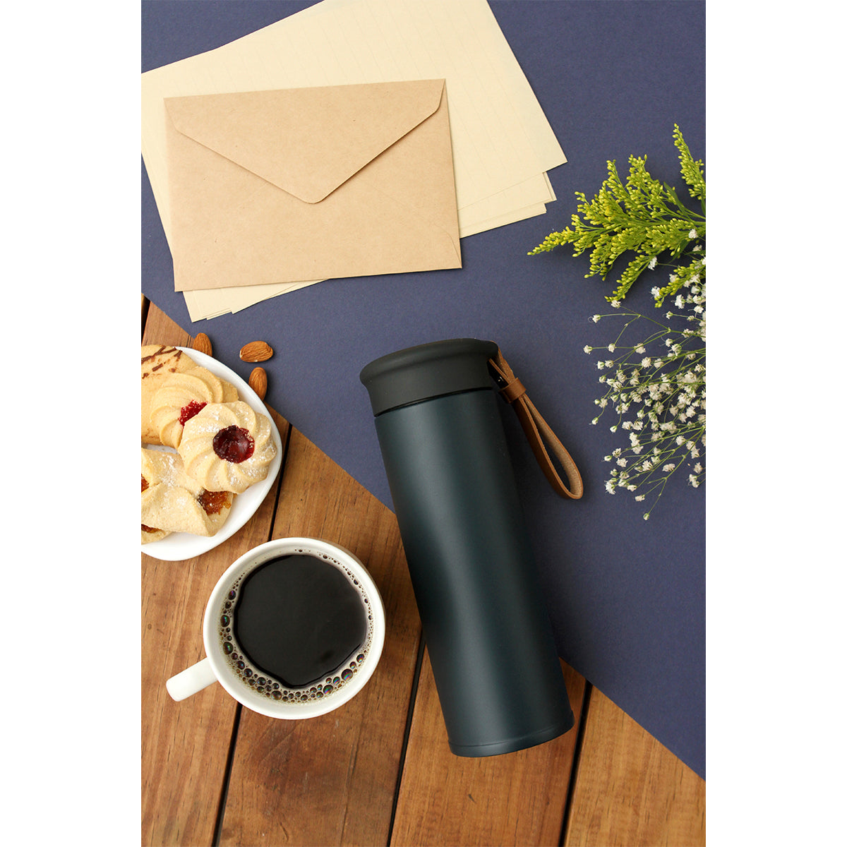 termo de acero inoxidable con doble pared, tapa de acrilonitrilo butadieno estireno (abs), rejilla para té y correa de piel. fabricado en materiales de grado alimenticio, mantiene bebidas frías o calientes por un largo tiempo, no usar en microondas. capacidad 450 ml. incluye caja de cartón individual