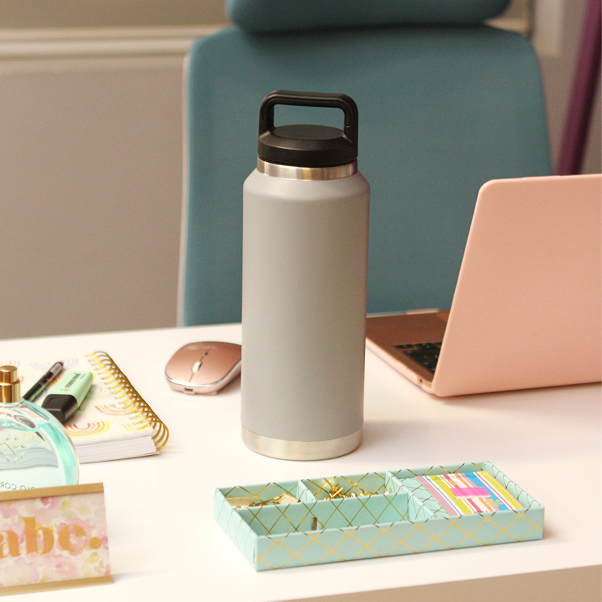 termo de acero inoxidable doble pared con tapa de rosca y agarradera, detalles plata en base y boquilla. fabricado en materiales de grado alimenticio, mantiene bebidas frías o calientes por un largo tiempo. no usar en microondas. capacidad de 1000 ml. incluye caja de cartón individual.