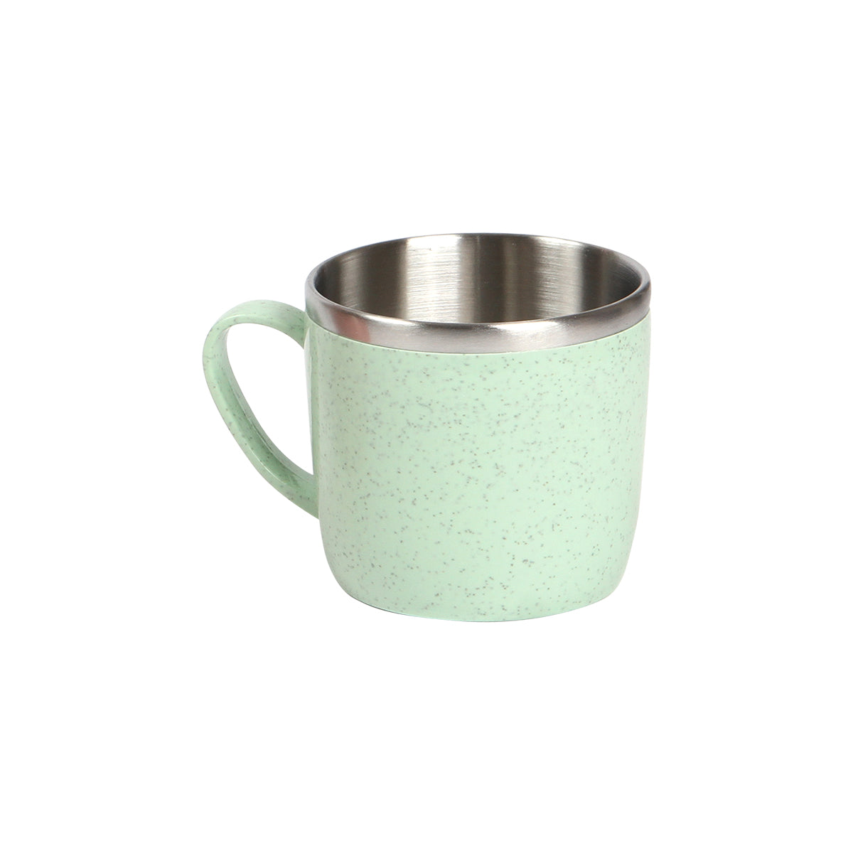 taza fabricada en fibra de trigo (20%) y plástico pp (80%), con pared interna de acero inoxidable, fabricada con materiales de grado alimenticio, no utilizar en microondas, capacidad de 200 ml. incluye caja de cartón individual.