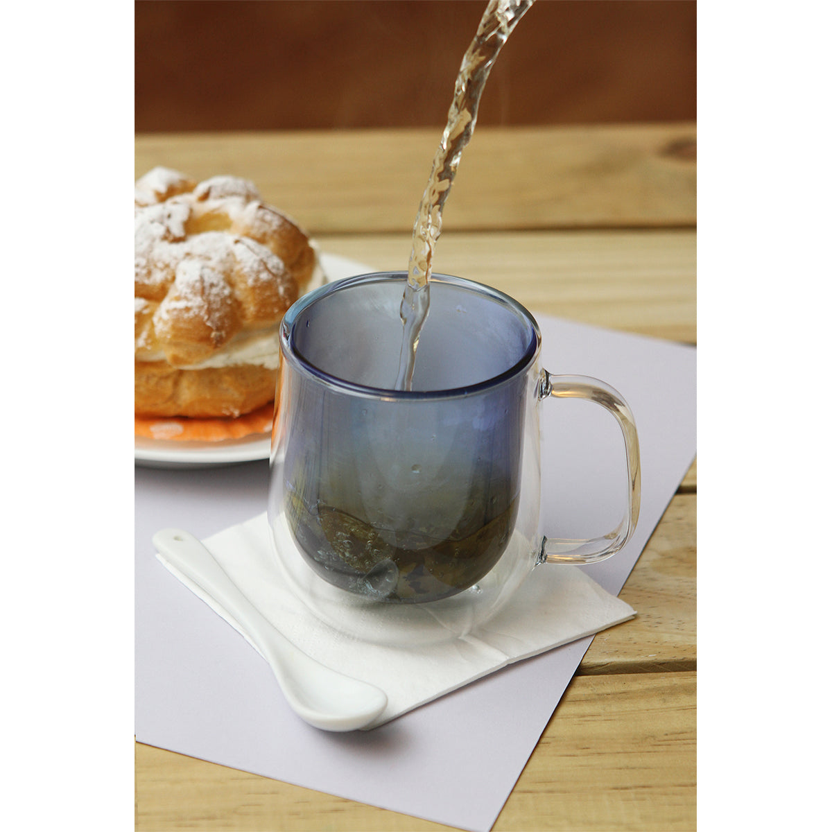 taza doble pared fabricada en vidrio de borosilicato, con detalle de color en la pared interna, fabricada en materiales de grado alimenticio, apta para microondas. capacidad de 250 ml. incluye caja de cartón individual.