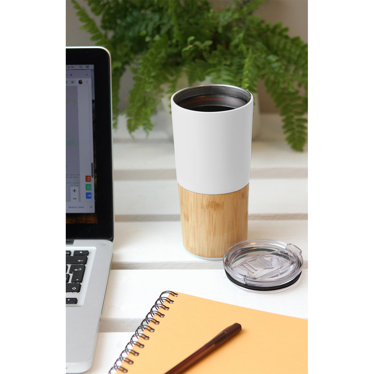 termo de acero inoxidable doble pared con detalle en bambú, tapa plástica deslizable, fabricado en materiales de grado alimenticio, mantiene bebidas frías o calientes por un largo tiempo. no usar en microondas. capacidad de 600 ml. incluye caja de cartón individual.